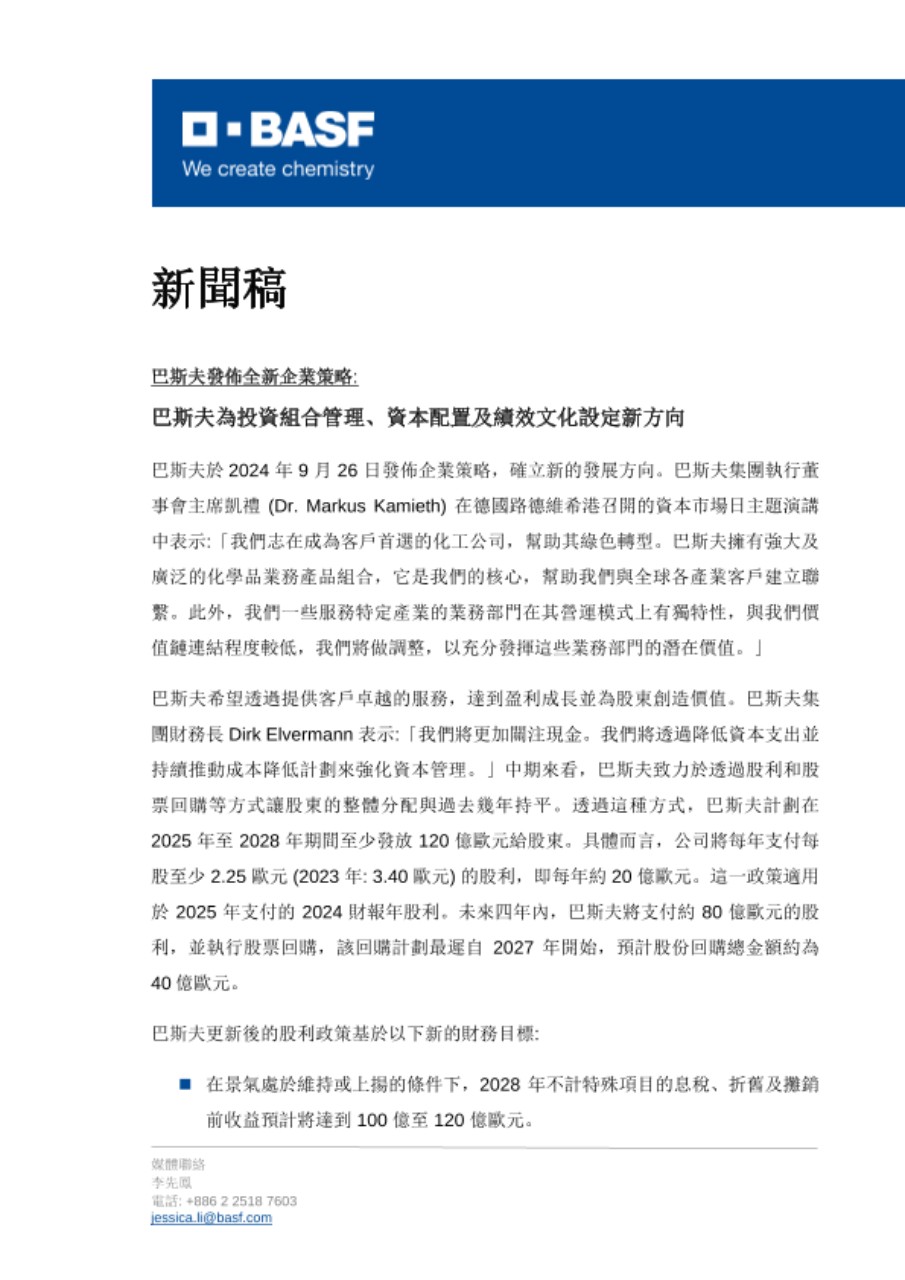 本新聞稿包含前瞻性陳述,這些陳述基於巴斯夫執行董事會目前的估計和推測以及現有資訊。前瞻性陳述並非其中概述的未來發展和結果之保證。這些取決於多種因素, 涉及各種風險和不確定性, 以及基於可能無法證明為正確的假設。巴斯夫不承擔在法律要求外更新本新聞稿中前瞻性陳述之義務。