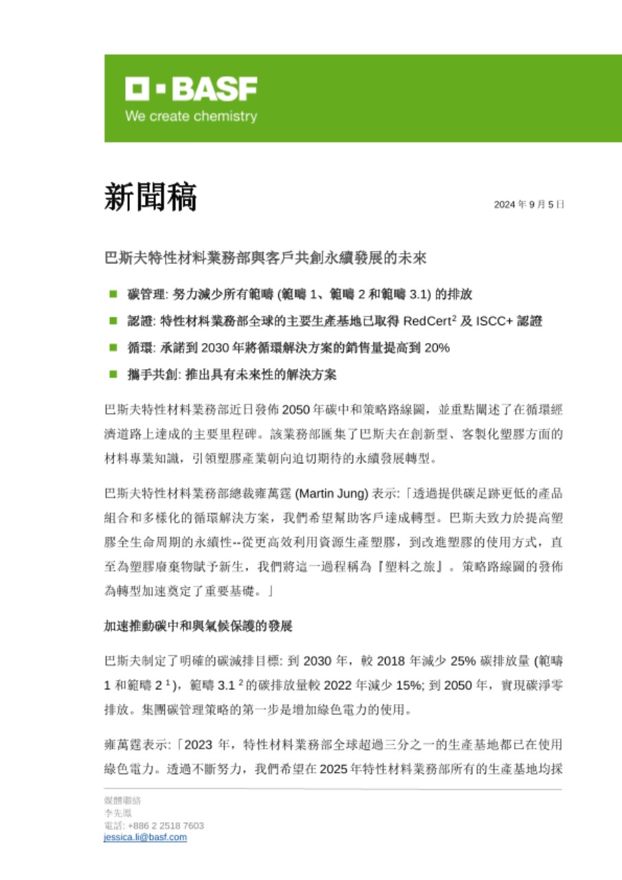 巴斯夫特性材料業務部總裁雍萬霆 (Martin Jung) 表示:「透過提供碳足跡更低的產品組合和多樣化的循環解決方案,我們希望幫助客戶達成轉型。巴斯夫致力於提高塑膠全生命周期的永續性--從更高效利用資源生產塑膠,到改進塑膠的使用方式,直至為塑膠廢棄物賦予新生,我們將這一過程稱為『塑料之旅』。策略路線圖的發佈為轉型加速奠定了重要基礎。」