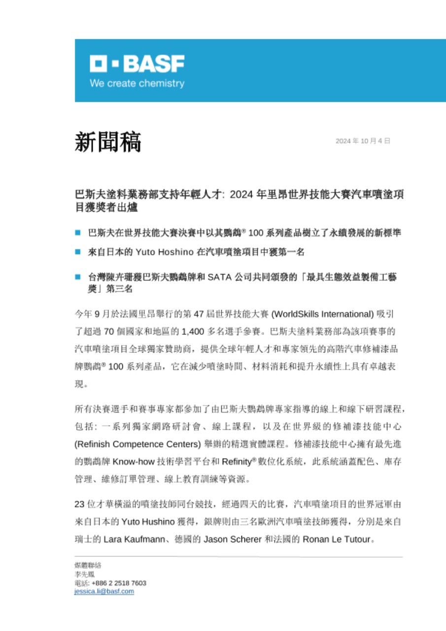 今年 9 月於法國里昂舉行的第 47 屆世界技能大賽 (WorldSkills International) 吸引了超過 70 個國家和地區的 1,400 多名選手參賽。巴斯夫塗料業務部為該項賽事的汽車噴塗項目全球獨家贊助商,提供全球年輕人才和專家領先的高階汽車修補漆品牌鸚鵡® 100 系列產品,它在減少噴塗時間、材料消耗和提升永續性上具有卓越表現。