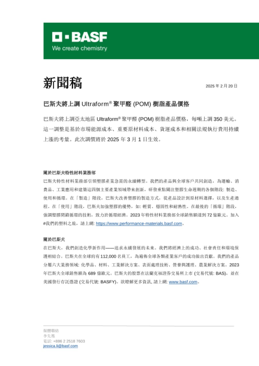 巴斯夫將上調亞太地區 Ultraform® 聚甲醛 (POM) 樹脂產品價格,每噸上調 350 美元。這一調整是基於市場能源成本、重要原材料成本、貨運成本和相關法規執行費用持續上漲的考量。此次調價將於 2025 年 3 月 1 日生效。
