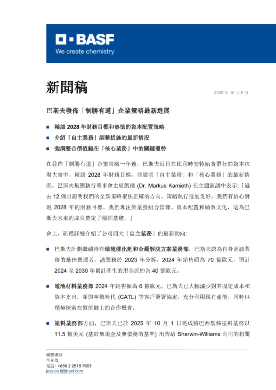 - 塗料業務部方面,巴斯夫已於 2025 年10 月 1 日完成將巴西裝飾塗料業務以11.5億美元 (基於無現金及無債務的基準) 出售給Sherwin-Williams公司的相關作業。2025 年第二季,巴斯夫與市場接觸,探索處理汽車原廠漆、汽車修補漆和表面處理業務的策略性方案,預計於今年第四季做出決定。該業務部 2024 年銷售額為 38 億歐元。