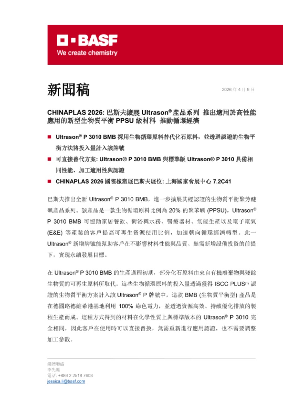 巴斯夫 Ultrason® 全球業務管理團隊 Nami Lohbeck表示:「透過 Ultrason® P 3010 BMB,我們協助客戶在永續發展的早期階段推動綠色轉型。選擇 Ultrason® P 3010 BMB,客戶不僅能推動化石資源的替代,增加可再生原料的使用比例,並透過額外的永續性優勢,使其產品從競爭中脫穎而出。」與 Ultrason® P 3010 標準牌號相同,Ultrason® P 3010 BMB 延續巴斯夫 PPSU 材料一貫的卓越性能,包括優異的耐高溫性、耐化學性、韌性以及長期耐久性。客戶可持續信賴其與標準牌號一致的性能表現和認證,適用於對安全性和品質要求極高的應用,如: 嬰兒奶瓶、飲用水接觸部件以及醫療器材。2025 年,巴斯夫率先推出生物質平衡型聚醚碸 (PESU) Ultrason® E 2010 BMB,該產品經 ISCC PLUS 認證的生物循環原料比例為 39%。