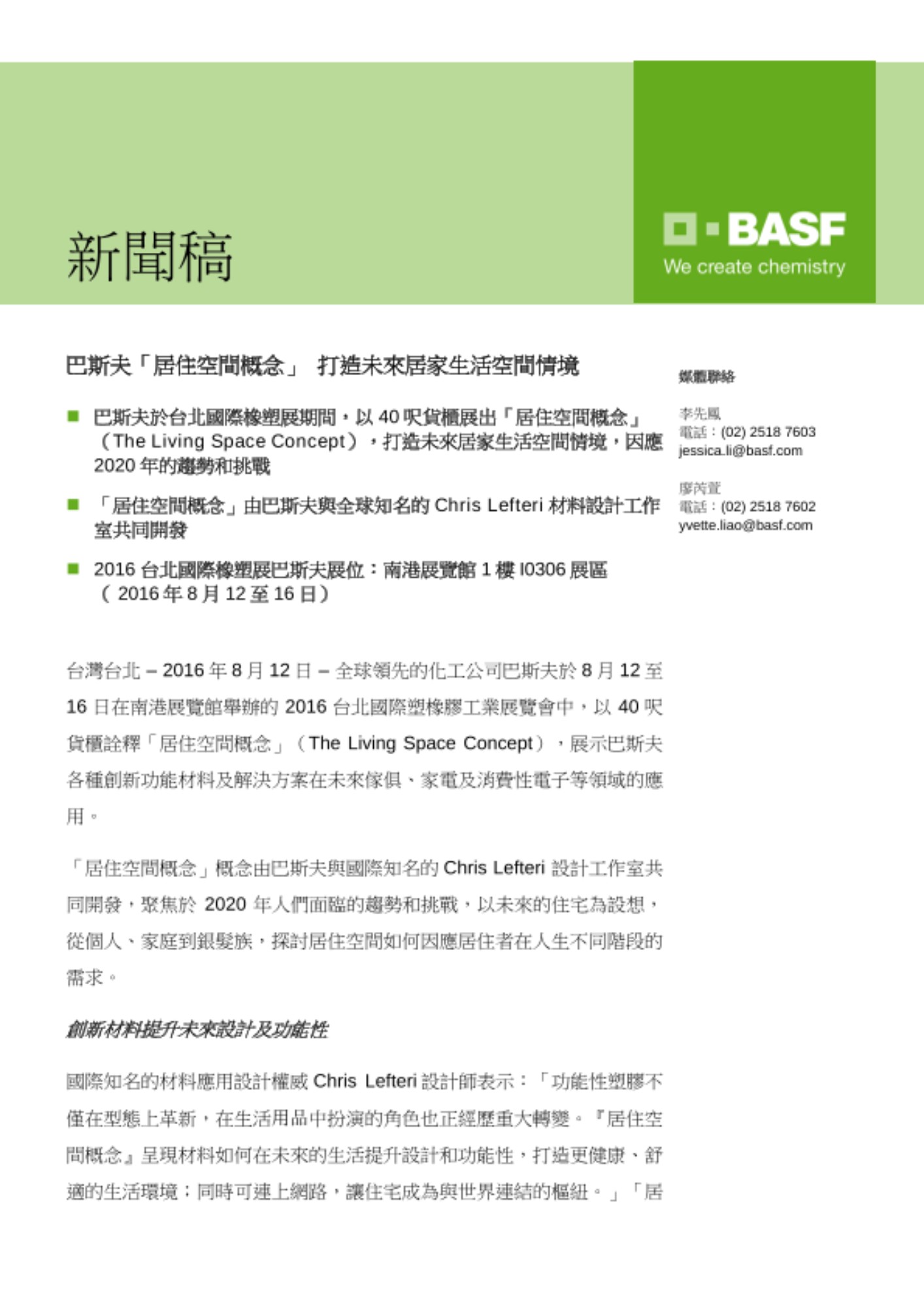 「居住空間概念」(The Living Space Concept)由巴斯夫與材料設計領域的頂尖專家Chris Lefteri 設計工作室共同開發。Chris Lefteri 設計工作室在倫敦、首爾和新加坡均設有分公司,並與各大產業的績優股公司以及歐美、亞洲區的大型設計公司合作,在設計過程中為材料的有效結合提供各種策略。Chris Lefteri設計工作室擁有豐富經驗,尤其為汽車、包裝、運動、傢俱和消費電子產品行業提供了全新的解決方案,服務的客戶包括:聯想、Google、BMW、Staples、LG 電子、飛利浦、羅技、華為和VW。Chris Lefteri設計工作室還為材料供應商如康寧玻璃、UPM、道康寧、埃克森美孚等提供服務,幫助他們更有效地與設計行業溝通並尋找新市場。如需更多資訊,請上網: www.chrislefteri.com