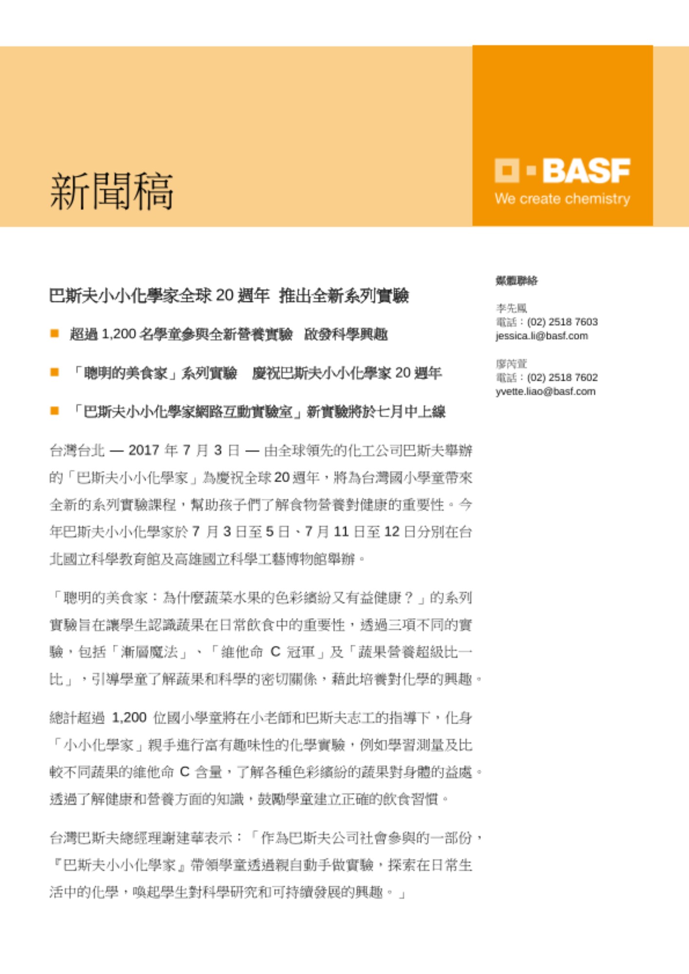 台灣台北 — 2017 年 7 月 3 日 — 由全球領先的化工公司巴斯夫舉辦的「巴斯夫小小化學家」為慶祝全球20週年,將為台灣國小學童帶來全新的系列實驗課程,幫助孩子們了解食物營養對健康的重要性。今年巴斯夫小小化學家於7 月3日至5日、7月11日至12日分別在台北國立科學教育館及高雄國立科學工藝博物館舉辦。