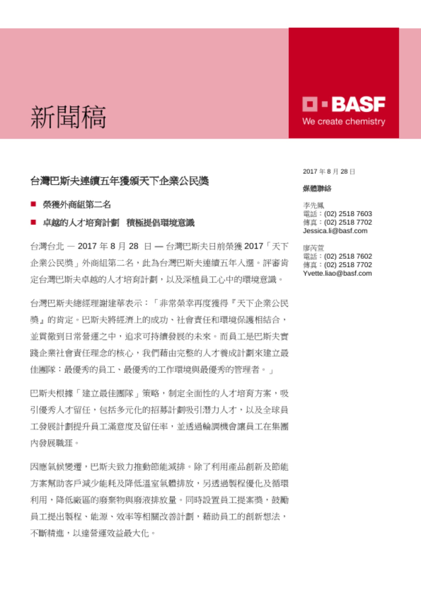 台灣台北 — 2017 年 8 月 28 日 — 台灣巴斯夫日前榮獲2017「天下企業公民獎」外商組第二名,此為台灣巴斯夫連續五年入選。評審肯定台灣巴斯夫卓越的人才培育計劃,以及深植員工心中的環境意識。