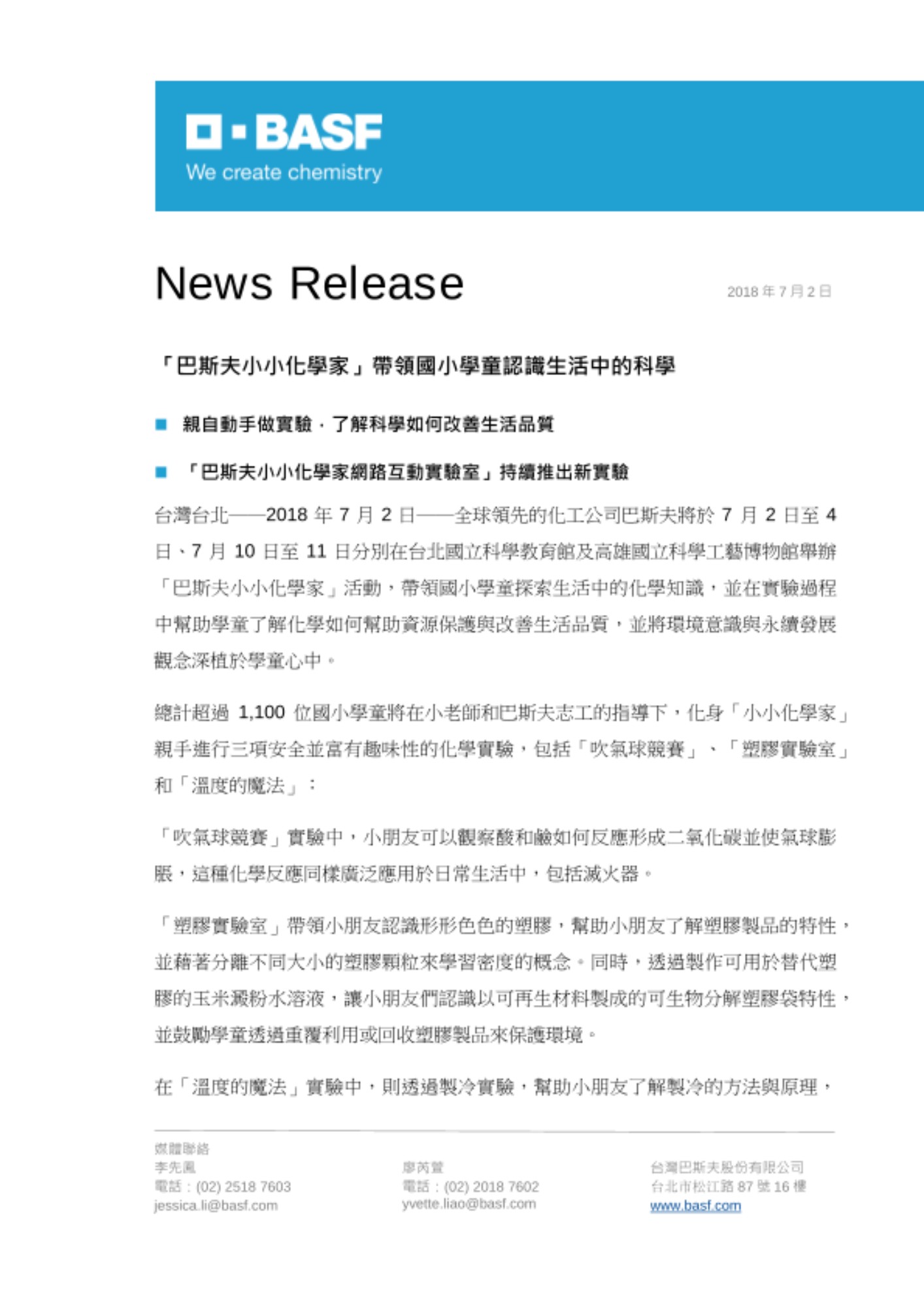 台灣台北──2018年7月2日──全球領先的化工公司巴斯夫將於7 月2日至4日、7月10日至11日分別在台北國立科學教育館及高雄國立科學工藝博物館舉辦「巴斯夫小小化學家」活動,帶領國小學童探索生活中的化學知識,並在實驗過程中幫助學童了解化學如何幫助資源保護與改善生活品質,並將環境意識與永續發展觀念深植於學童心中。