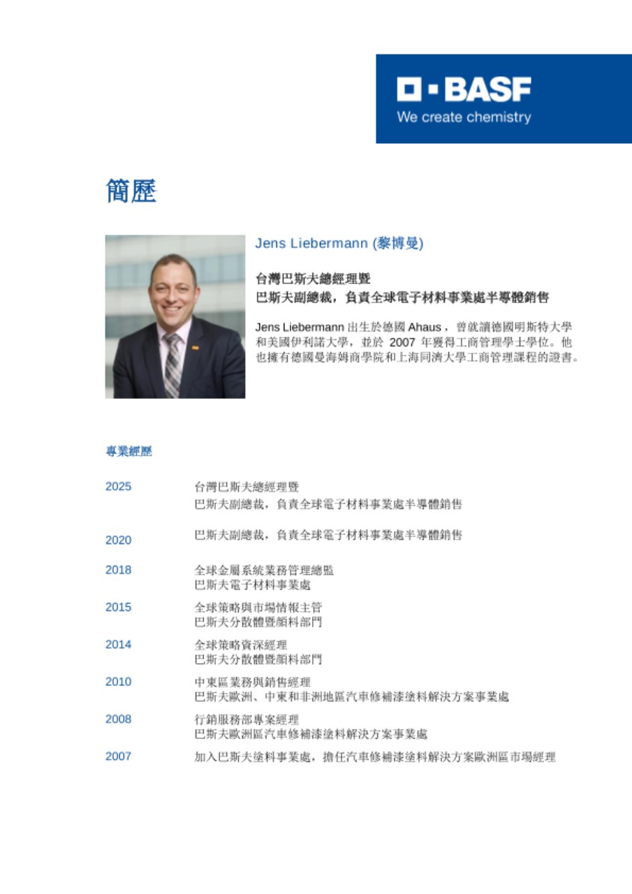 Jens Liebermann 於 2007 年加入巴斯夫塗料部門,專注於汽車塗料領域,歷練過行銷、業務管理和策略規劃等職務,累積豐富的經驗; 之後,負責巴斯夫全球電子材料事業處金屬系統的業務管理。自 2020 年起,擔任巴斯夫副總裁,負責全球電子材料事業處半導體銷售,專注於提供半導體產業超高純度化學品和先進製程化學品配方,並在推動電子材料事業處的策略發展和組織重整上扮演重要角色。