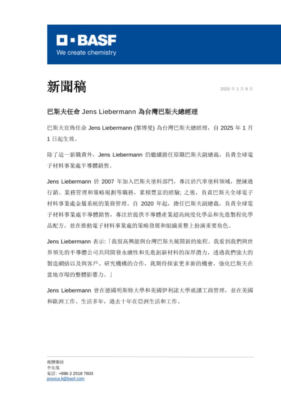 除了這一新職責外,Jens Liebermann 仍繼續擔任原職巴斯夫副總裁,負責全球電子材料事業處半導體銷售。