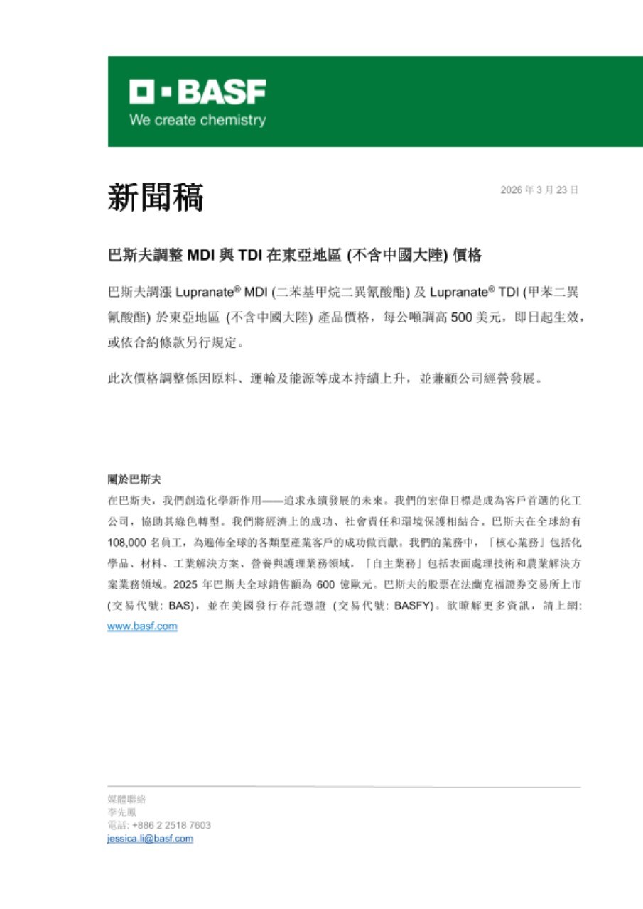 巴斯夫調漲 Lupranate® MDI (二苯基甲烷二異氰酸酯) 及 Lupranate® TDI (甲苯二異氰酸酯) 於東亞地區 (不含中國大陸) 產品價格,每公噸調高 500 美元,即日起生效,或依合約條款另行規定。