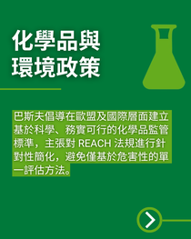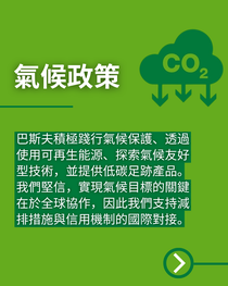 這表明巴斯夫將其核心流程與永續發展理念結合。 其中的一個核心的觀點是,我們認為社會、生態和經濟指標同等重要。這並非易事,需要權衡利弊。因此,我們必須在社會層面協商規則如何制定。我們認為,積极參與社會和政治討論是我們的責任之一。重要的是,各利益群體應就一個共同、可靠的框架達成一致。例如,我們堅定支援《巴黎氣候協定》。