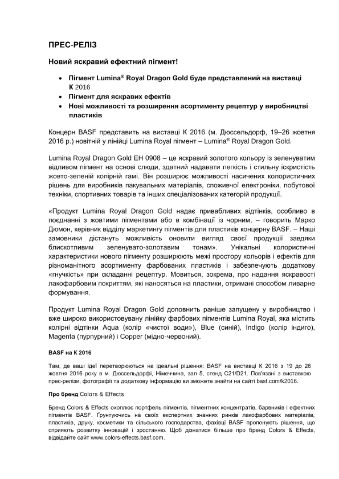 Концерн BASF представить на виставці К 2016 (м. Дюссельдорф, 19–26 жовтня 2016 р.) новітній у лінійці Lumina Royal пігмент – Lumina® Royal Dragon Gold.