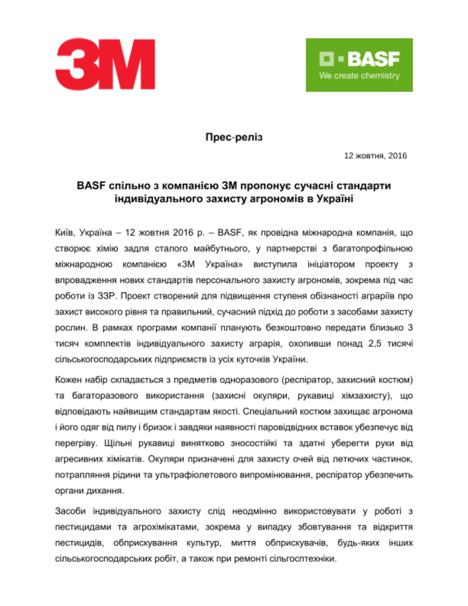 Київ, Україна – 12 жовтня 2016 р. – BASF, як провідна міжнародна компанія, що створює хімію задля сталого майбутнього, у партнерстві з багатопрофільною міжнародною компанією «3M Україна» виступила ініціатором проекту з впровадження нових стандартів персонального захисту агрономів, зокрема під час роботи із ЗЗР. Проект створений для підвищення ступеня обізнаності аграріїв про захист високого рівня та правильний, сучасний підхід до роботи з засобами захисту рослин. В рамках програми компанії планують безкоштовно передати близько 3 тисяч комплектів індивідуального захисту аграрія, охопивши понад 2,5 тисячі сільськогосподарських підприємств із усіх куточків України.