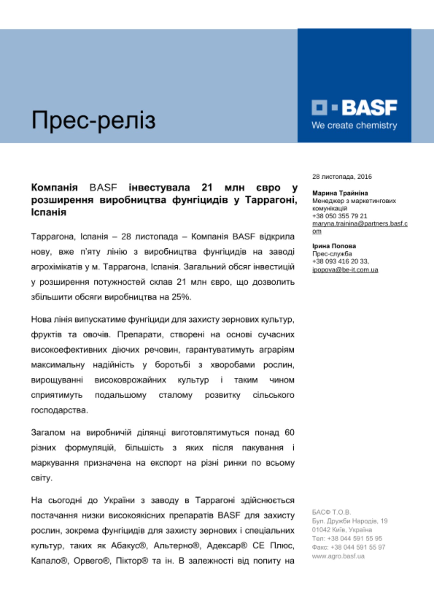 Таррагона, Іспанія – 28 листопада 2016 р. – Компанія BASF відкрила нову, вже п’яту лінію з виробництва фунгіцидів на заводі агрохімікатів у м. Таррагона, Іспанія. Загальний обсяг інвестицій у розширення потужностей склав 21 млн євро, що дозволить збільшити обсяги виробництва на 25%.