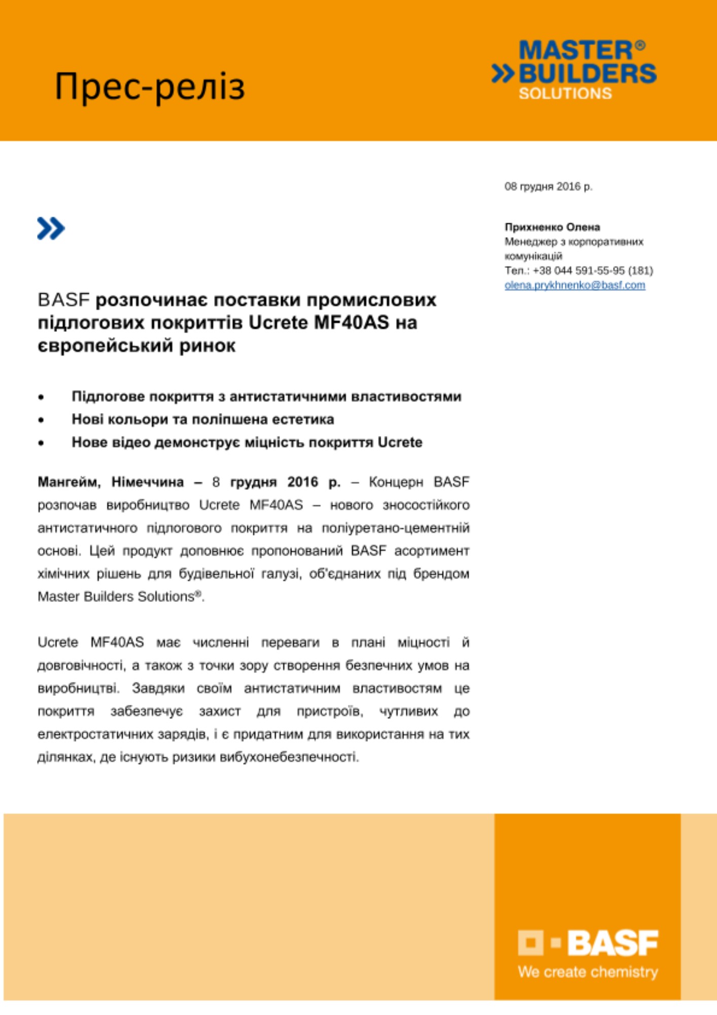 Мангейм, Німеччина – 8 грудня 2016 р. – Концерн BASF розпочав виробництво Ucrete MF40AS – нового зносостійкого антистатичного підлогового покриття на поліуретано-цементній основі. Цей продукт доповнює пропонований BASF асортимент хімічних рішень для будівельної галузі, об'єднаних під брендом Master Builders Solutions®.