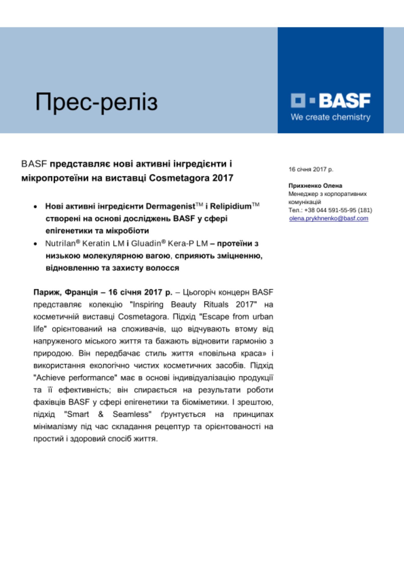 Париж, Франція – 16 січня 2017 р. – Цьогоріч концерн BASF представляє колекцію "Inspiring Beauty Rituals 2017" на косметичній виставці Cosmetagora. Підхід "Escape from urban life" орієнтований на споживачів, що відчувають втому від напруженого міського життя та бажають відновити гармонію з природою. Він передбачає стиль життя «повільна краса» і використання екологічно чистих косметичних засобів. Підхід "Achieve performance" має в основі індивідуалізацію продукції та її ефективність; він спирається на результати роботи фахівців BASF у сфері епігенетики та біоміметики. І зрештою, підхід "Smart & Seamless" ґрунтується на принципах мінімалізму під час складання рецептур та орієнтованості на простий і здоровий спосіб життя.