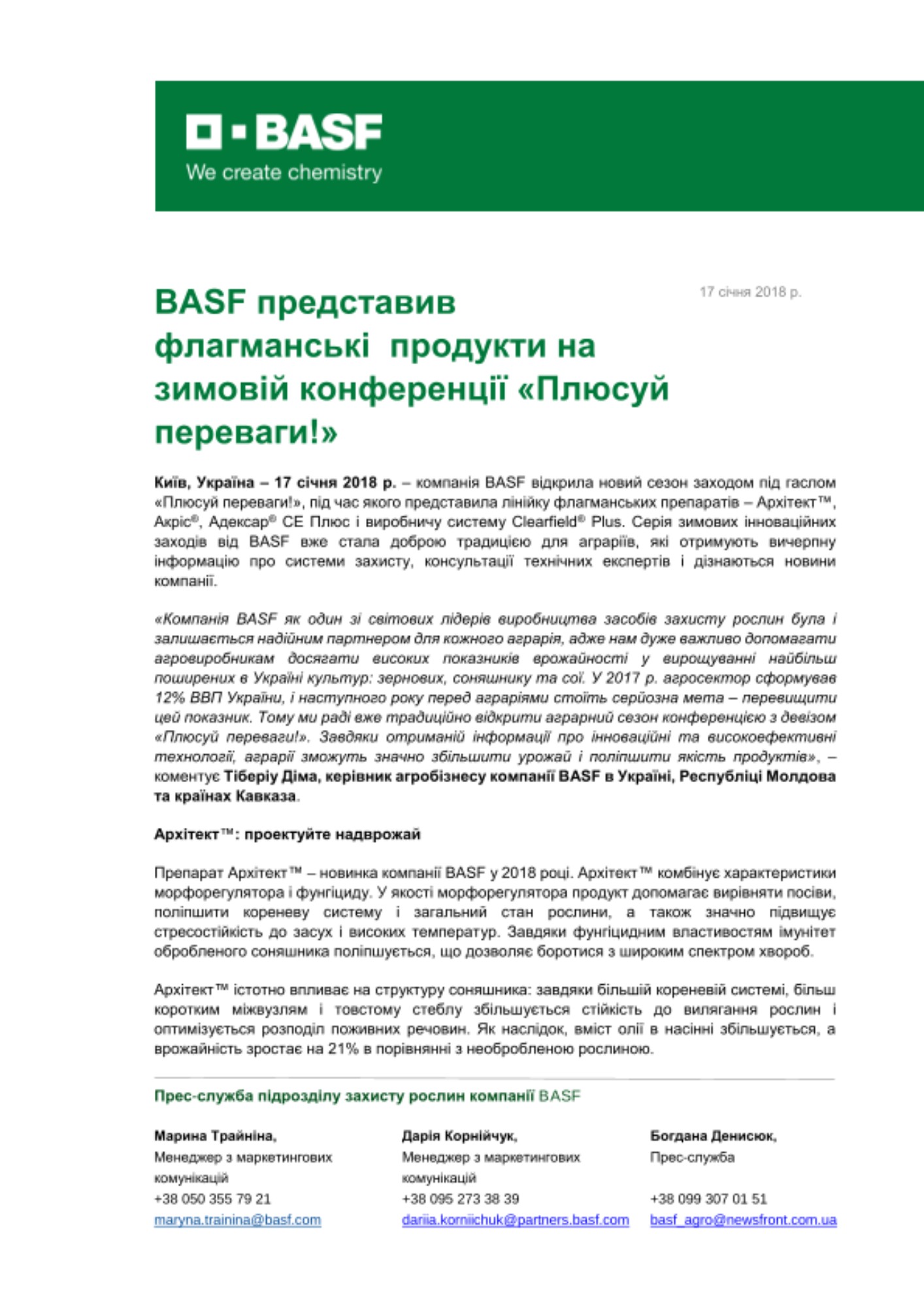 Київ, Україна – 17 січня 2018 р. – компанія BASF відкрила новий сезон заходом під гаслом «Плюсуй переваги!», під час якого представила лінійку флагманських препаратів – Архітект™, Акріс®, Адексар® СЕ Плюс і виробничу систему Clearfield® Plus. Серія зимових інноваційних заходів від BASF вже стала доброю традицією для аграріїв, які отримують вичерпну інформацію про системи захисту, консультації технічних експертів і дізнаються новини компанії.