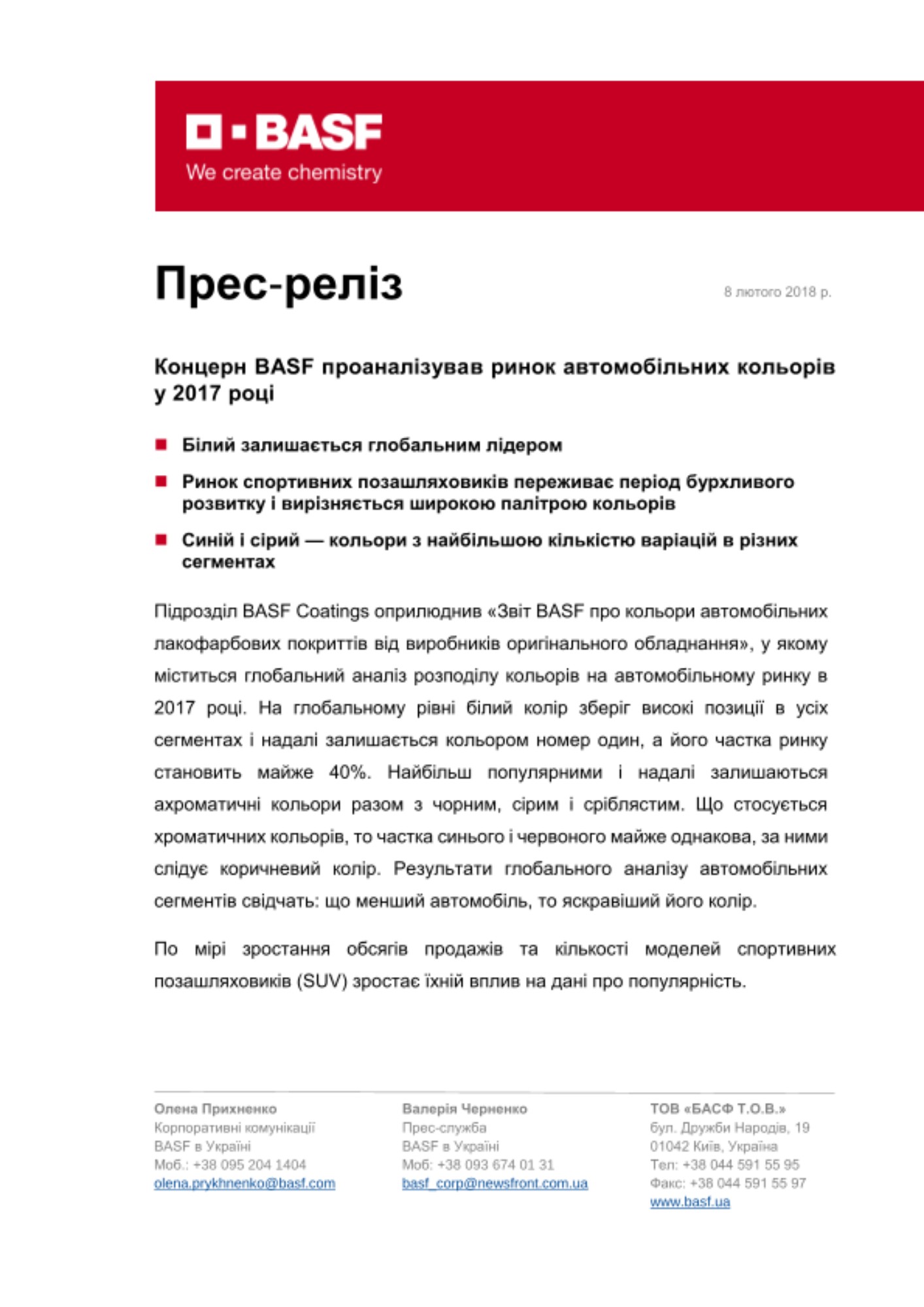 Підрозділ BASF Coatings оприлюднив «Звіт BASF про кольори автомобільних лакофарбових покриттів від виробників оригінального обладнання», у якому міститься глобальний аналіз розподілу кольорів на автомобільному ринку в 2017 році. На глобальному рівні білий колір зберіг високі позиції в усіх сегментах і надалі залишається кольором номер один, а його частка ринку становить майже 40%. Найбільш популярними і надалі залишаються ахроматичні кольори разом з чорним, сірим і сріблястим. Що стосується хроматичних кольорів, то частка синього і червоного майже однакова, за ними слідує коричневий колір. Результати глобального аналізу автомобільних сегментів свідчать: що менший автомобіль, то яскравіший його колір.
