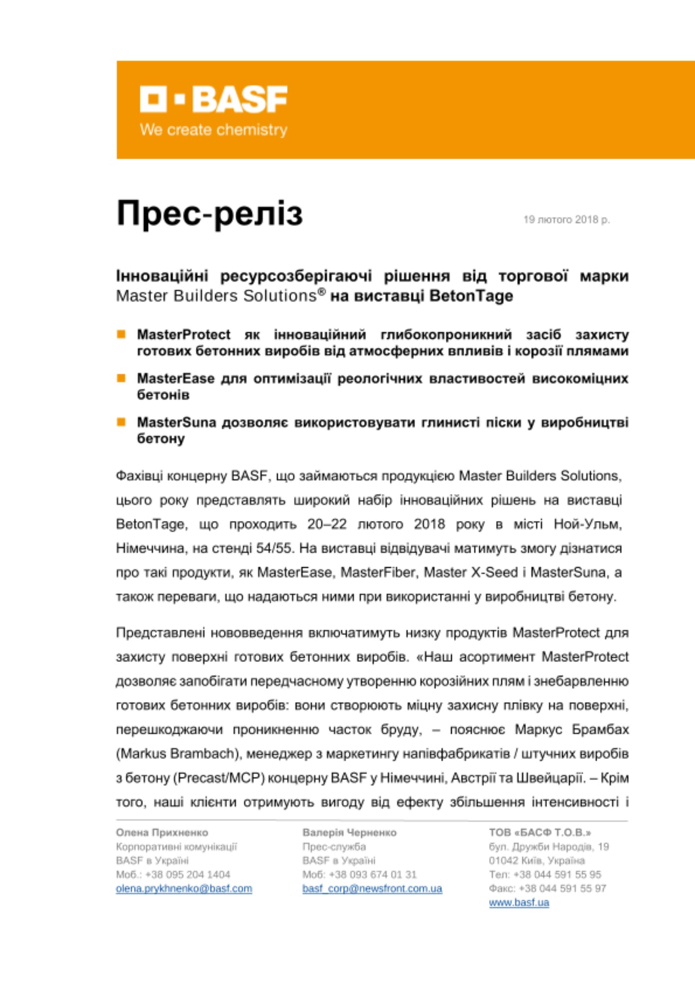 Використовуючи міжнародну торговельну марку Master Builders Solutions, підрозділ будівельної хімії концерну BASF пропонує передові рішення на основі хімічних технологій для будівництва нових об'єктів, технічного обслуговування, ремонту та реконструкції споруд. Великий асортимент нашої продукції включає добавки в бетони, добавки для цементів, розчини хімікатів для будівництва підземних об'єктів, затворювачі, системи захисту і ремонту бетонів, розчини з високими характеристиками, промислові підлоги, розчини для укладання плитки, температурні компенсатори, а також розчини для захисту деревних матеріалів.