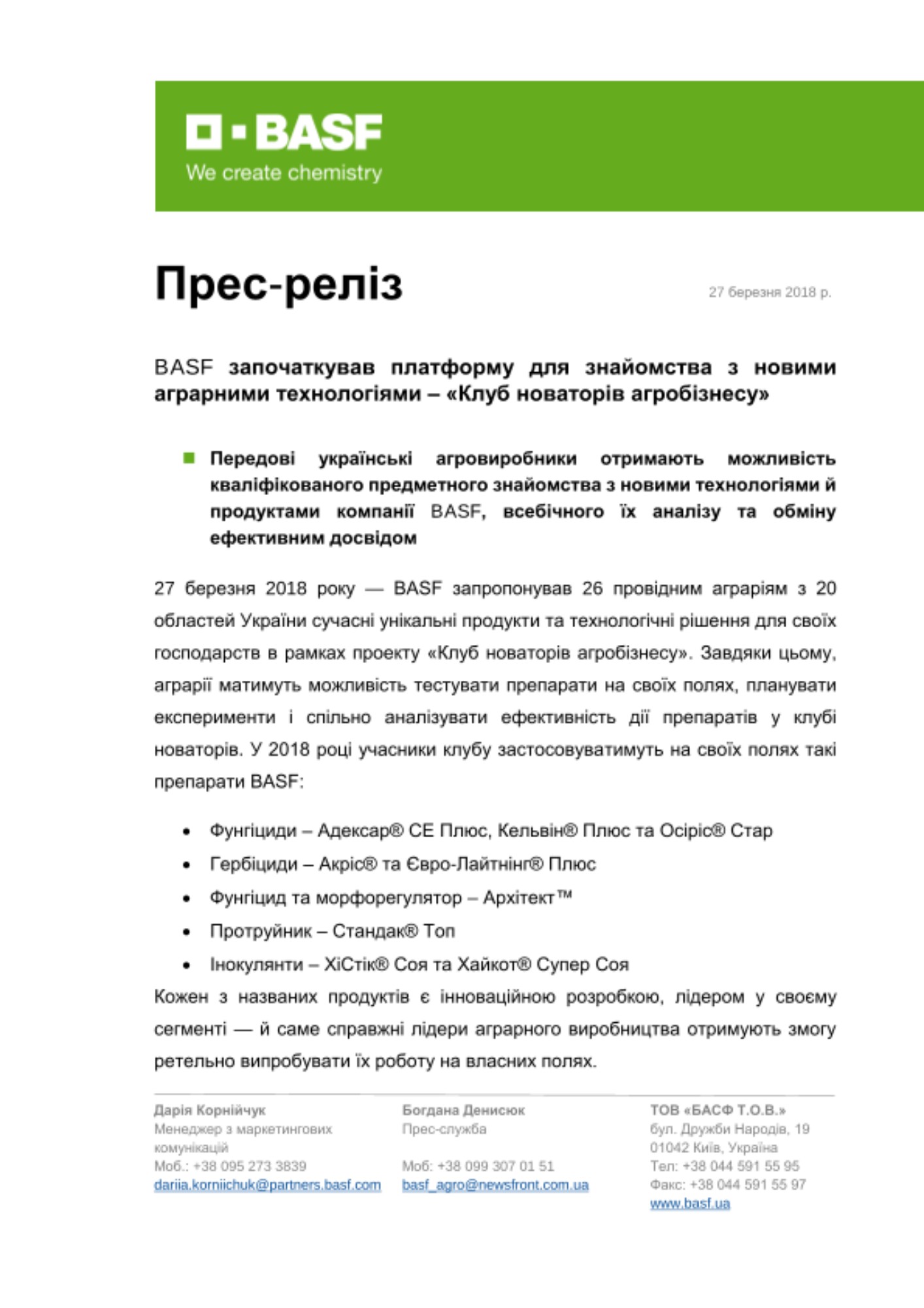 27 березня 2018 року — BASF запропонував 26 провідним аграріям з 20 областей України сучасні унікальні продукти та технологічні рішення для своїх господарств в рамках проекту «Клуб новаторів агробізнесу». Завдяки цьому, аграрії матимуть можливість тестувати препарати на своїх полях, планувати експерименти і спільно аналізувати ефективність дії препаратів у клубі новаторів. У 2018 році учасники клубу застосовуватимуть на своїх полях такі препарати BASF: