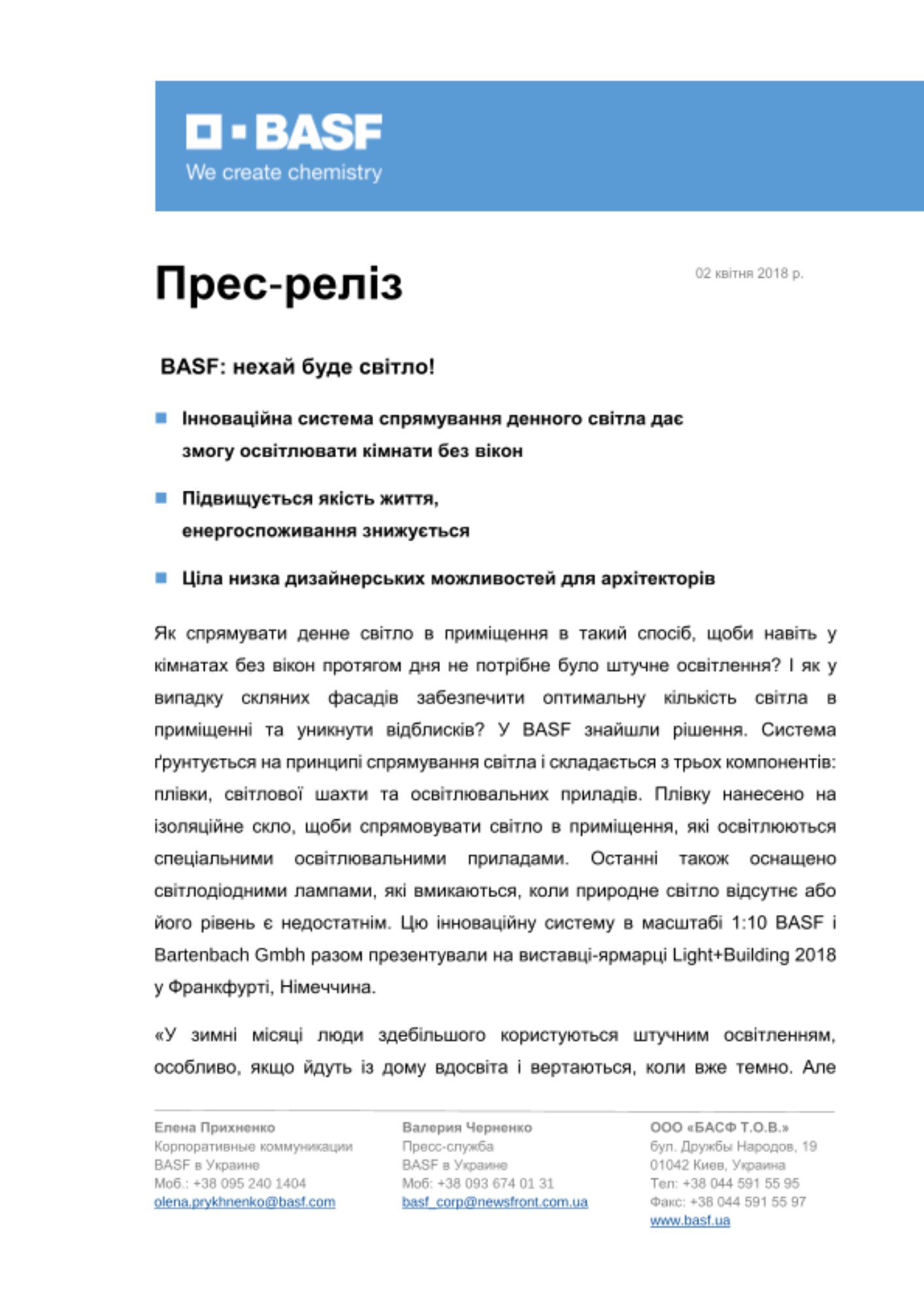 Як спрямувати денне світло в приміщення в такий спосіб, щоби навіть у кімнатах без вікон протягом дня не потрібне було штучне освітлення? І як у випадку скляних фасадів забезпечити оптимальну кількість світла в приміщенні та уникнути відблисків? У BASF знайшли рішення. Система ґрунтується на принципі спрямування світла і складається з трьох компонентів: плівки, світлової шахти та освітлювальних приладів. Плівку нанесено на ізоляційне скло, щоби спрямовувати світло в приміщення, які освітлюються спеціальними освітлювальними приладами. Останні також оснащено світлодіодними лампами, які вмикаються, коли природне світло відсутнє або його рівень є недостатнім. Цю інноваційну систему в масштабі 1:10 BASF і Bartenbach Gmbh разом презентували на виставці-ярмарці Light+Building 2018 у Франкфурті, Німеччина.