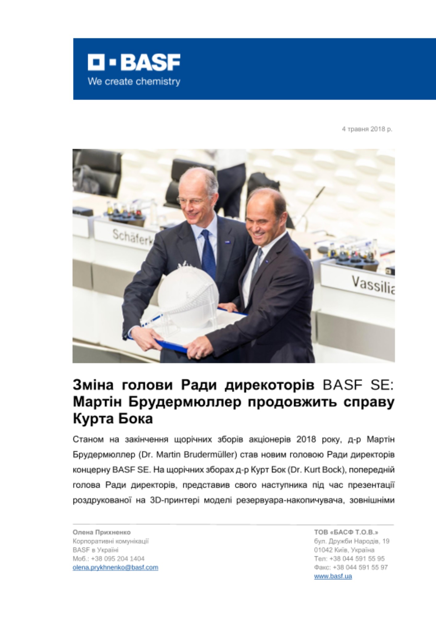 Станом на закінчення щорічних зборів акціонерів 2018 року, д-р Мартін Брудермюллер (Dr. Martin Brudermüller) став новим головою Ради директорів концерну BASF SE. На щорічних зборах д-р Курт Бок (Dr. Kurt Bock), попередній голова Ради директорів, представив свого наступника під час презентації роздрукованої на 3D-принтері моделі резервуара-накопичувача, зовнішніми сходами якого піднімається співробітник BASF, досягаючи найвищої точки. Мініатюру зроблено з полімолочної кислоти з використанням процесу екструзії компанією BigRep GmbH, стратегічним партнером BASF 3D Printing Solutions GmbH.