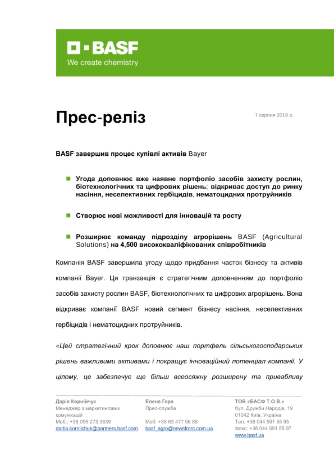 Компанія BASF завершила угоду щодо придбання часток бізнесу та активів компанії Bayer. Ця транзакція є стратегічним доповненням до портфоліо засобів захисту рослин BASF, біотехнологічних та цифрових агрорішень. Вона відкриває компанії BASF новий сегмент бізнесу насіння, неселективних гербіцидів і нематоцидних протруйників.