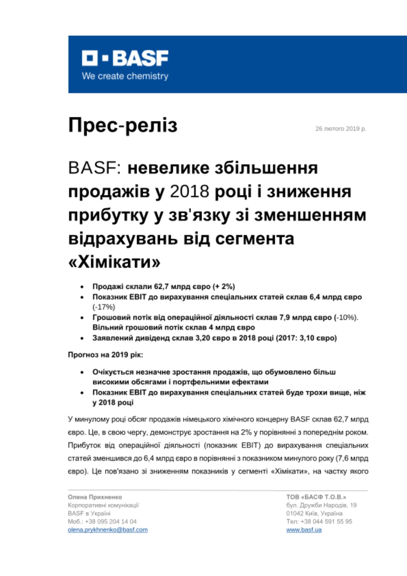 «Ми на шляху вирішення цих проблем. З реалізацією нашої нової корпоративної стратегії ми використаємо можливості 2019 року, як перехідного, щоб стати ще сильніше. У цьому році ми адаптуємо наші структури і процеси, а також чітко сфокусуємо наш бізнес на потребах клієнтів», - коментує голова Ради директорів BASF SE Мартін Брудермюллер, який представив фінансові показники за 2018 рік, спільно з фінансовим директором Хансом-Ульріхом Енгелем.