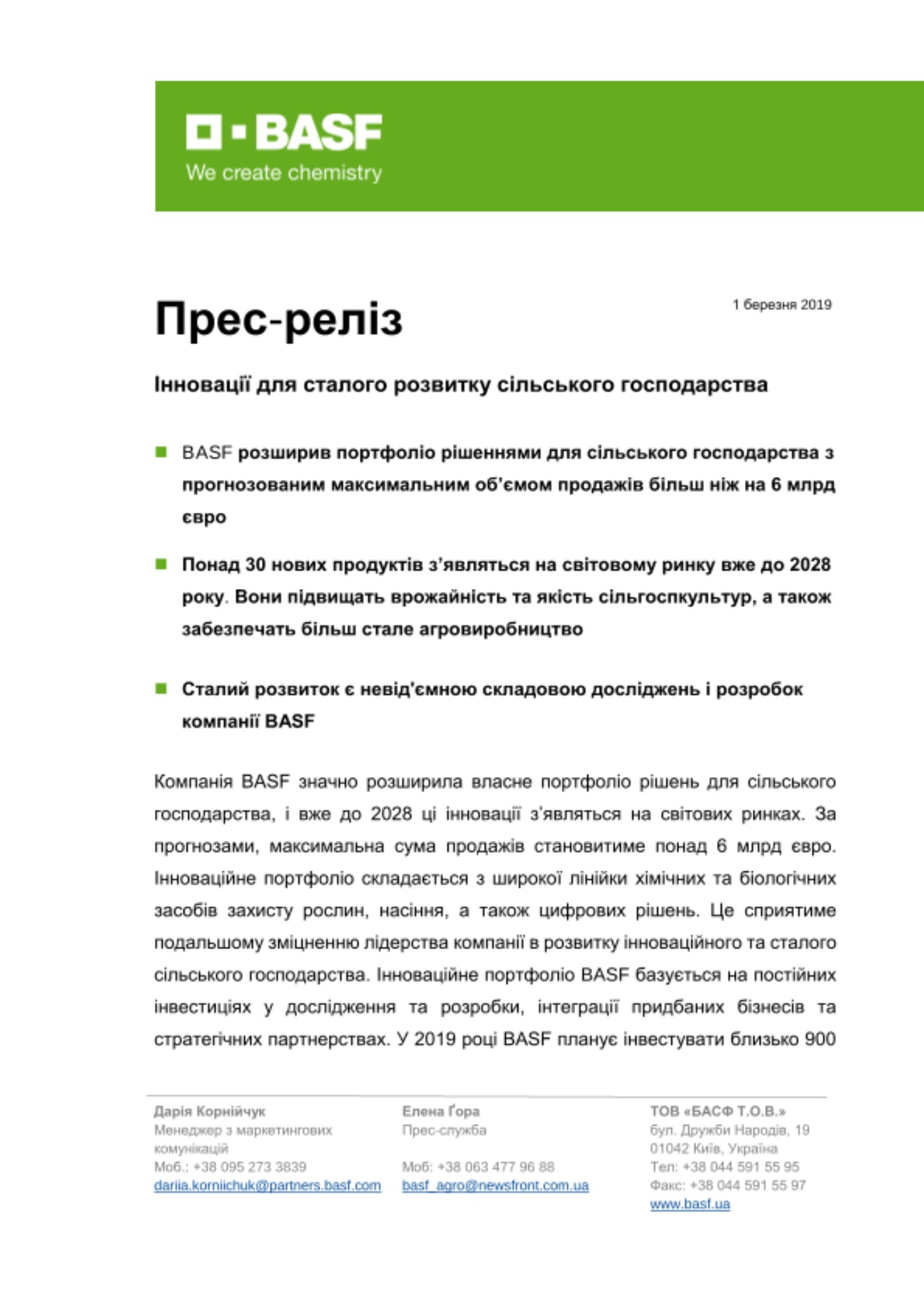 Компанія BASF значно розширила власне портфоліо рішень для сільського господарства, і вже до 2028 ці інновації з’являться на світових ринках. За прогнозами, максимальна сума продажів становитиме понад 6 млрд євро. Інноваційне портфоліо складається з широкої лінійки хімічних та біологічних засобів захисту рослин, насіння, а також цифрових рішень. Це сприятиме подальшому зміцненню лідерства компанії в розвитку інноваційного та сталого сільського господарства. Інноваційне портфоліо BASF базується на постійних інвестиціях у дослідження та розробки, інтеграції придбаних бізнесів та стратегічних партнерствах. У 2019 році BASF планує інвестувати близько 900 млн євро у наукові дослідження для розробки першокласних сільськогосподарських рішень.