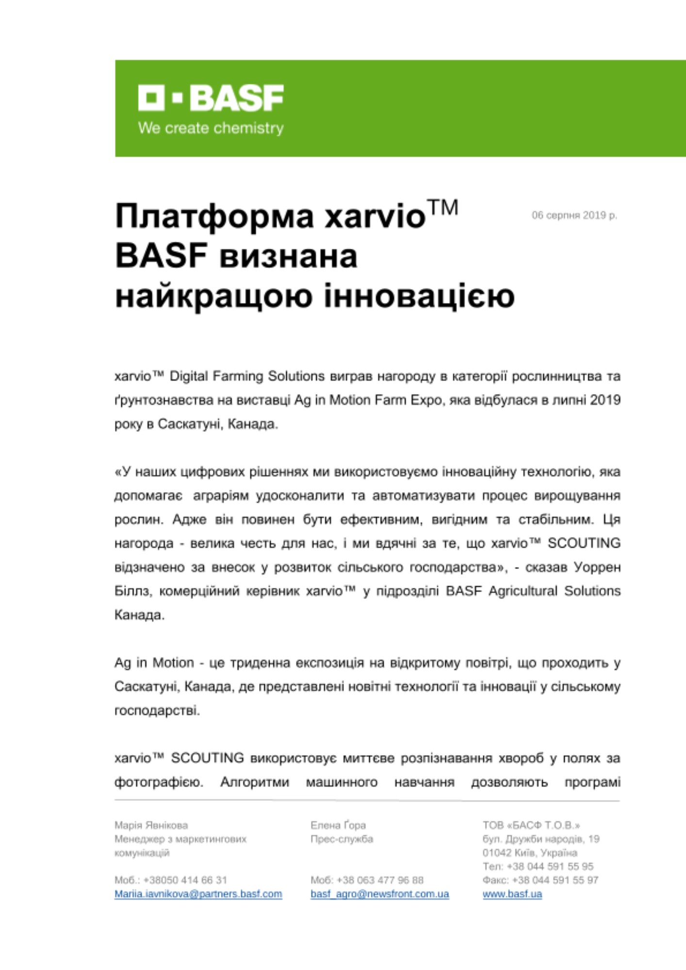 «У наших цифрових рішеннях ми використовуємо інноваційну технологію, яка допомагає аграріям удосконалити та автоматизувати процес вирощування рослин. Адже він повинен бути ефективним, вигідним та стабільним. Ця нагорода - велика честь для нас, і ми вдячні за те, що xarvio™ SCOUTING відзначено за внесок у розвиток сільського господарства», - сказав Уоррен Біллз, комерційний керівник xarvio™ у підрозділі BASF Agricultural Solutions Канада.