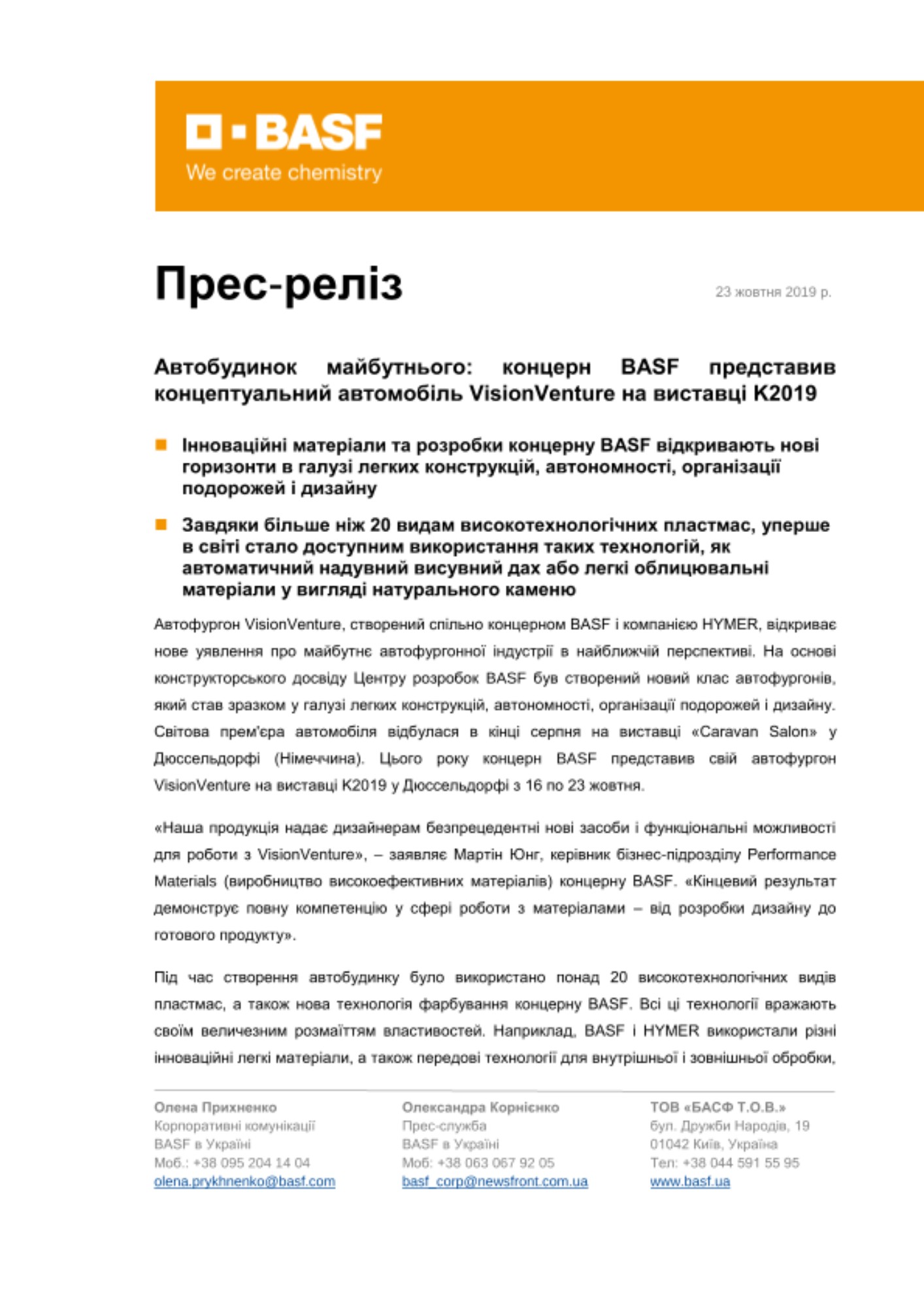 Автофургон VisionVenture, створений спільно концерном BASF і компанією HYMER, відкриває нове уявлення про майбутнє автофургонної індустрії в найближчій перспективі. На основі конструкторського досвіду Центру розробок BASF був створений новий клас автофургонів, який став зразком у галузі легких конструкцій, автономності, організації подорожей і дизайну. Світова прем'єра автомобіля відбулася в кінці серпня на виставці «Caravan Salon» у Дюссельдорфі (Німеччина). Цього року концерн BASF представив свій автофургон VisionVenture на виставці K2019 у Дюссельдорфі з 16 по 23 жовтня.