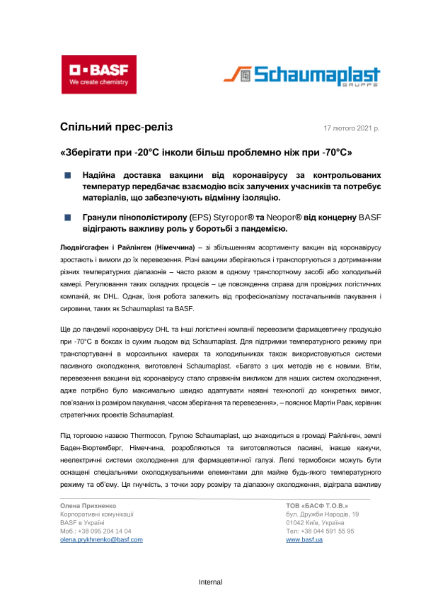 Людвіґсгафен і Райлінген (Німеччина) – зі збільшенням асортименту вакцин від коронавірусу зростають і вимоги до їх перевезення. Різні вакцини зберігаються і транспортуються з дотриманням різних температурних діапазонів – часто разом в одному транспортному засобі або холодильній камері. Регулювання таких складних процесів – це повсякденна справа для провідних логістичних компаній, як DHL. Однак, їхня робота залежить від професіоналізму постачальників пакування і сировини, таких як Schaumaplast та BASF.