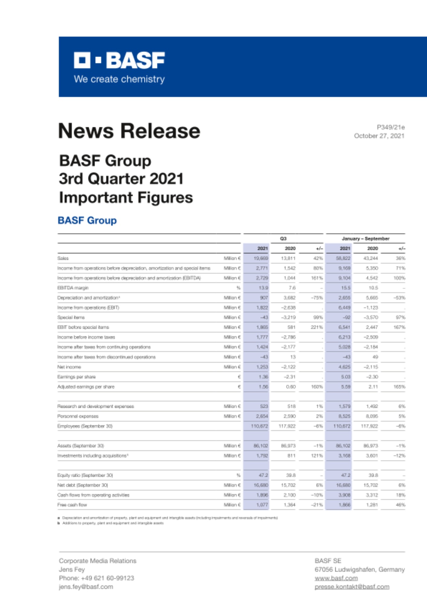 Обсяг продажів за третій квартал 2021 року зафіксовано на рівні 19,7 млрд євро, що на 5,9 млрд євро вище, ніж за аналогічний період минулого року. Це значною мірою пов’язано з вищими цінами в усіх сегментах, особливо у сегментах «Хімічні речовини», «Поверхнево-активні речовини та технології» і «Матеріали». Зростання продажів також зумовлене значним збільшенням обсягів продажів практично в усіх сегментах.