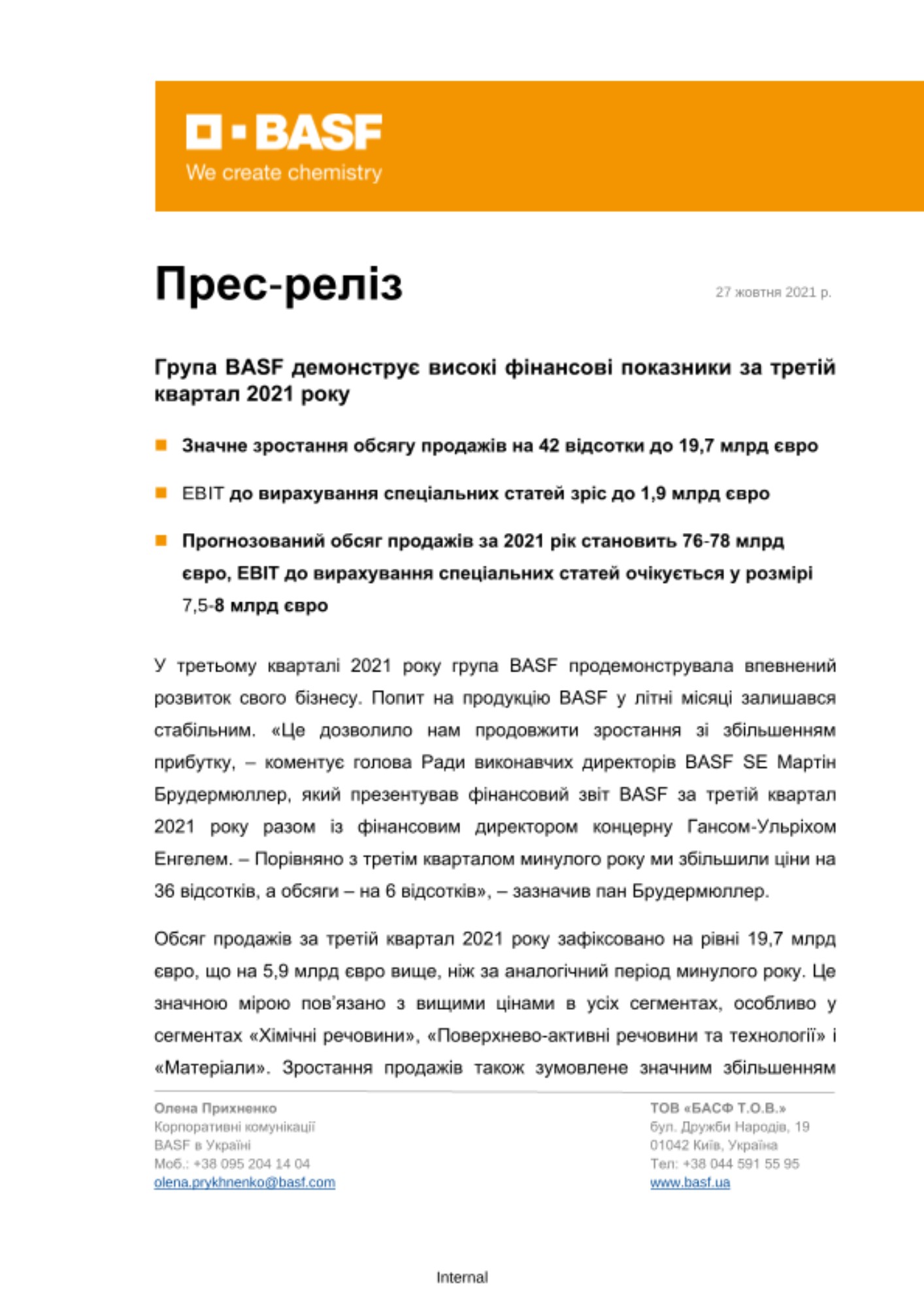 У третьому кварталі 2021 року група BASF продемонструвала впевнений розвиток свого бізнесу. Попит на продукцію BASF у літні місяці залишався стабільним. «Це дозволило нам продовжити зростання зі збільшенням прибутку, – коментує голова Ради виконавчих директорів BASF SE Мартін Брудермюллер, який презентував фінансовий звіт BASF за третій квартал 2021 року разом із фінансовим директором концерну Гансом-Ульріхом Енгелем. – Порівняно з третім кварталом минулого року ми збільшили ціни на 36 відсотків, а обсяги – на 6 відсотків», – зазначив пан Брудермюллер.