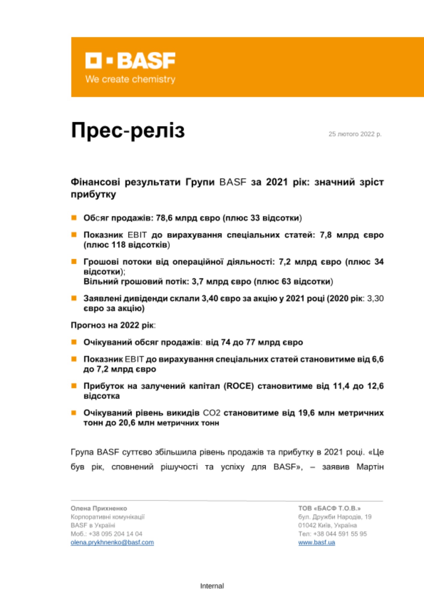Група BASF суттєво збільшила рівень продажів та прибутку в 2021 році. «Це був рік, сповнений рішучості та успіху для BASF», – заявив Мартін Брудермюллер, голова Ради виконавчих директорів BASF, який представив звіт за 2021 рік разом із Гансом-Ульріхом Енгелем, фінансовим директором.
