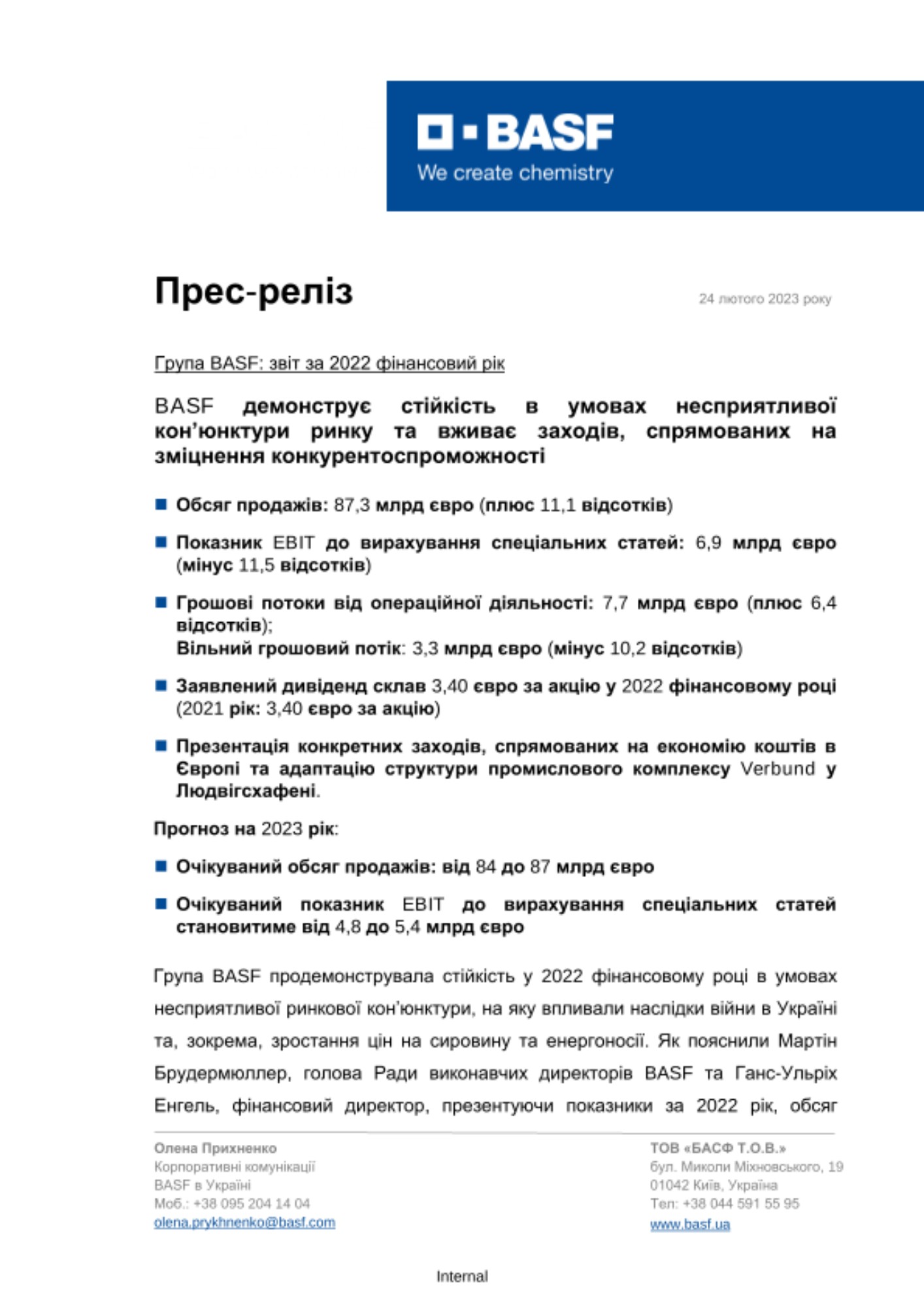 Група BASF продемонструвала стійкість у 2022 фінансовому році в умовах несприятливої ринкової кон’юнктури, на яку впливали наслідки війни в Україні та, зокрема, зростання цін на сировину та енергоносії. Як пояснили Мартін Брудермюллер, голова Ради виконавчих директорів BASF та Ганс-Ульріх Енгель, фінансовий директор, презентуючи показники за 2022 рік, обсяг продажів BASF збільшився на 11,1 відсотків і досяг 87,3 млрд євро. Зростання продажів здебільшого було зумовлено вищими цінами майже в усіх сегментах через підвищення вартості сировини та енергоносіїв. У сегментах «Матеріали» та «Хімічні речовини» ціни сягнули найвищих позначок. Значно нижчі обсяги в цілому стримали ріст рівня продажів у Групі BASF. На динаміку продажів перш за все вплинув нижчий рівень продажів у сегментах «Поверхнево-активні речовини та технології» і «Хімічні речовини».