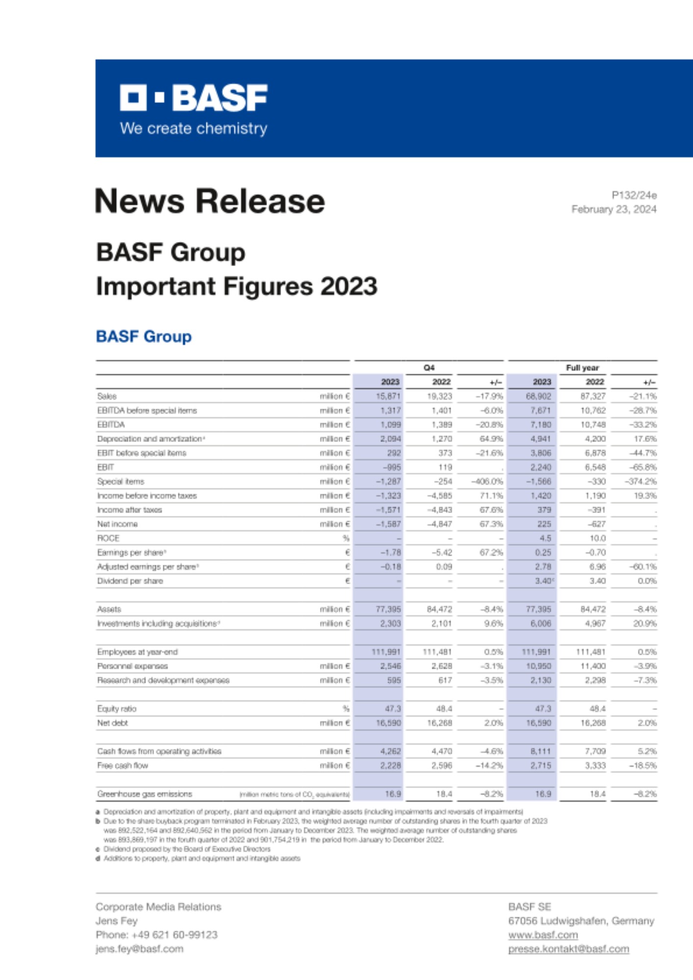 В умовах ринкового середовища, окресленого економічною нестабільністю, Група BASF відзвітувала про обсяг продажів на рівні 68,9 млрд євро у 2023 фінансовому році на противагу 87,3 млрд євро у попередньому році. Такі показники продажів головним чином є результатом значно нижчих цін та обсягів. Зокрема, зниження цін на сировину призвело до зниження цін майже в усіх сегментах. Обсяги продажів впали в усіх сегментах внаслідок низького рівня попиту з боку споживачів багатьох галузей. Попри те, BASF продемонстрував економічну стійкість: грошові потоки від операційної діяльності зросли на 5,2 відсотка у річному обчисленні та досягли 8,1 млрд євро. Компанія вже оприлюднила попередні дані за весь 2023 рік 19 січня 2024 року. Сьогодні д-р Мартін Брудермюллер, голова Ради виконавчих директорів BASF, та фінансовий директор BASF д-р Дірк Ельверманн, представили детальний процес розвитку бізнесу у 2023 році та оголосили про подальшу програму для виробничого комплексу в Людвіґсгафені з додатковою щорічною економією витрат у розмірі 1 млрд євро до кінця 2026 року. Це на додаток до чинної програми скорочення витрат у невиробничих підрозділах з акцентом на Європу та адаптацію виробничих структур у Людвіґсгафені.
