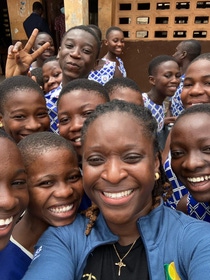 While visiting Ghana, Mayeana went to a local primary school, Laterbiokorshie 6, in Accra, the capital city of Ghana, where the student-teacher ratio is 80 to 1. This is one of the schools the National Society of Black Engineers (NSBE) Ghana supports by providing school supplies and scientific equipment, such as microscopes.