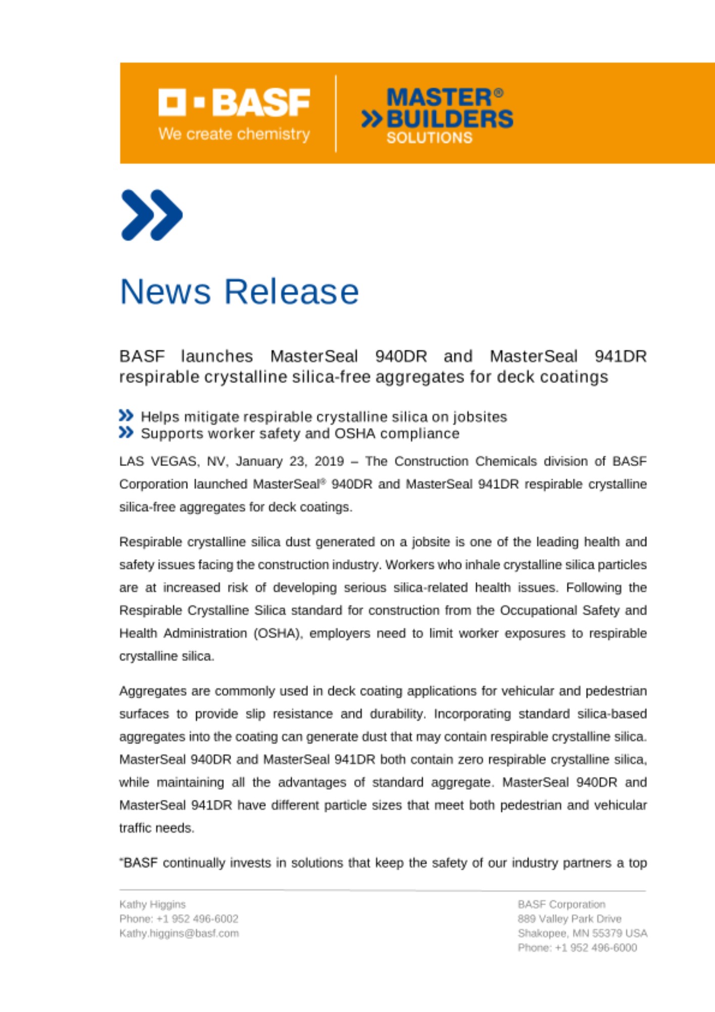 LAS VEGAS, NV, January 23, 2019 – The Construction Chemicals division of BASF Corporation launched MasterSeal® 940DR and MasterSeal 941DR respirable crystalline silica-free aggregates for deck coatings.