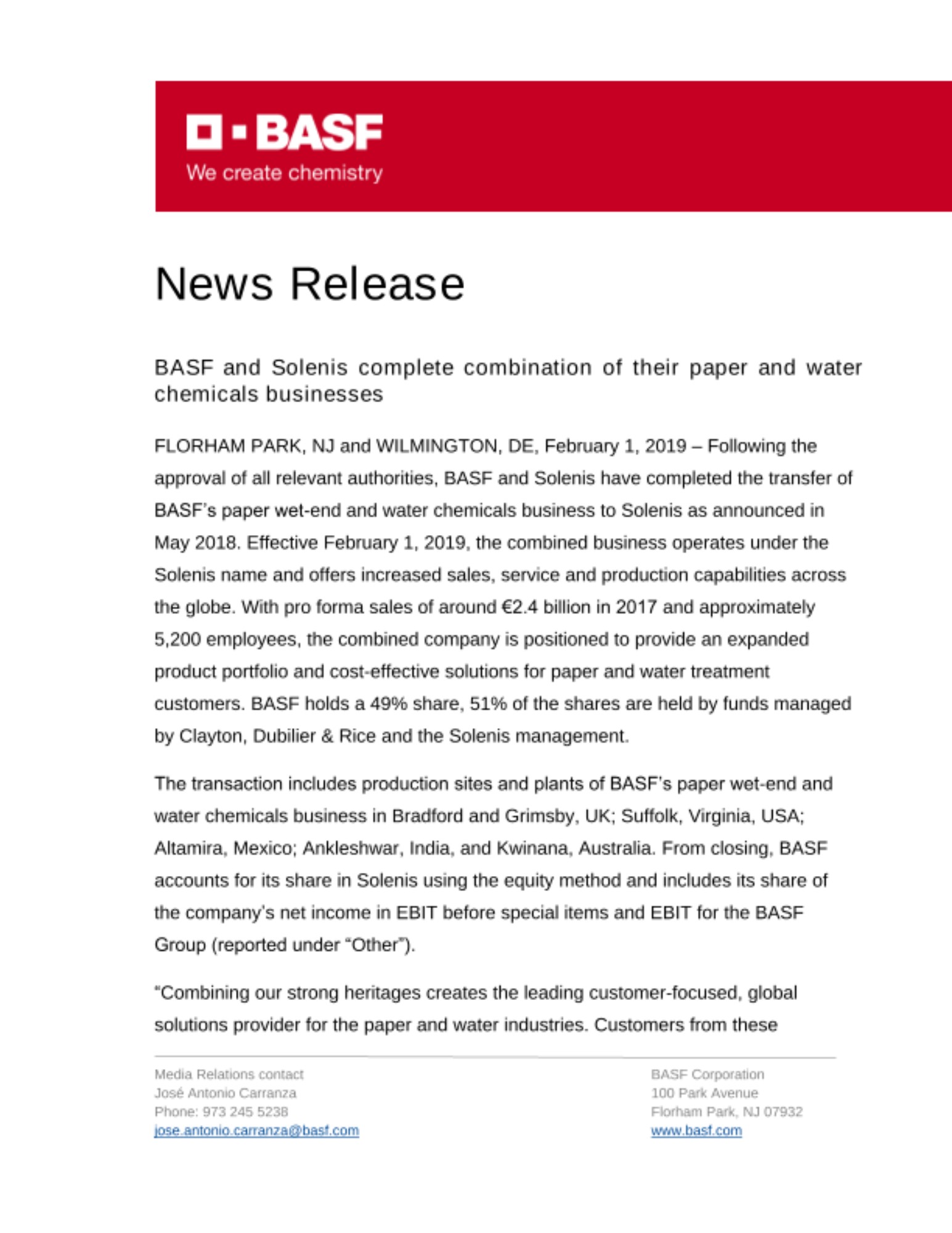 FLORHAM PARK, NJ and WILMINGTON, DE, February 1, 2019 – Following the approval of all relevant authorities, BASF and Solenis have completed the transfer of BASF’s paper wet-end and water chemicals business to Solenis as announced in May 2018. Effective February 1, 2019, the combined business operates under the Solenis name and offers increased sales, service and production capabilities across the globe. With pro forma sales of around €2.4 billion in 2017 and approximately 5,200 employees, the combined company is positioned to provide an expanded product portfolio and cost-effective solutions for paper and water treatment customers. BASF holds a 49% share, 51% of the shares are held by funds managed by Clayton, Dubilier & Rice and the Solenis management.