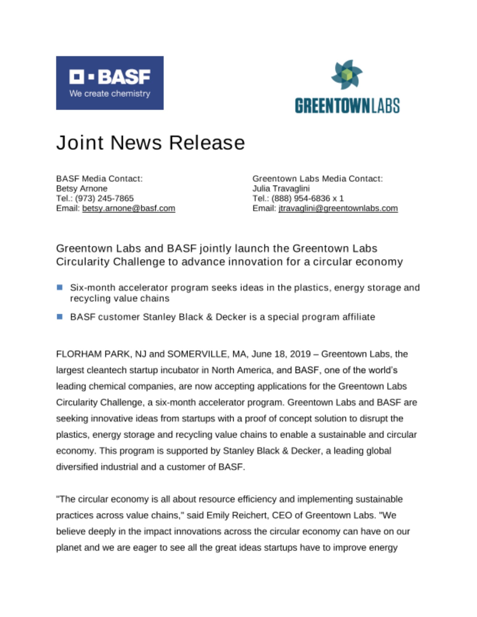 FLORHAM PARK, NJ and SOMERVILLE, MA, June 18, 2019 – Greentown Labs, the largest cleantech startup incubator in North America, and BASF, one of the world’s leading chemical companies, are now accepting applications for the Greentown Labs Circularity Challenge, a six-month accelerator program. Greentown Labs and BASF are seeking innovative ideas from startups with a proof of concept solution to disrupt the plastics, energy storage and recycling value chains to enable a sustainable and circular economy. This program is supported by Stanley Black & Decker, a leading global diversified industrial and a customer of BASF.