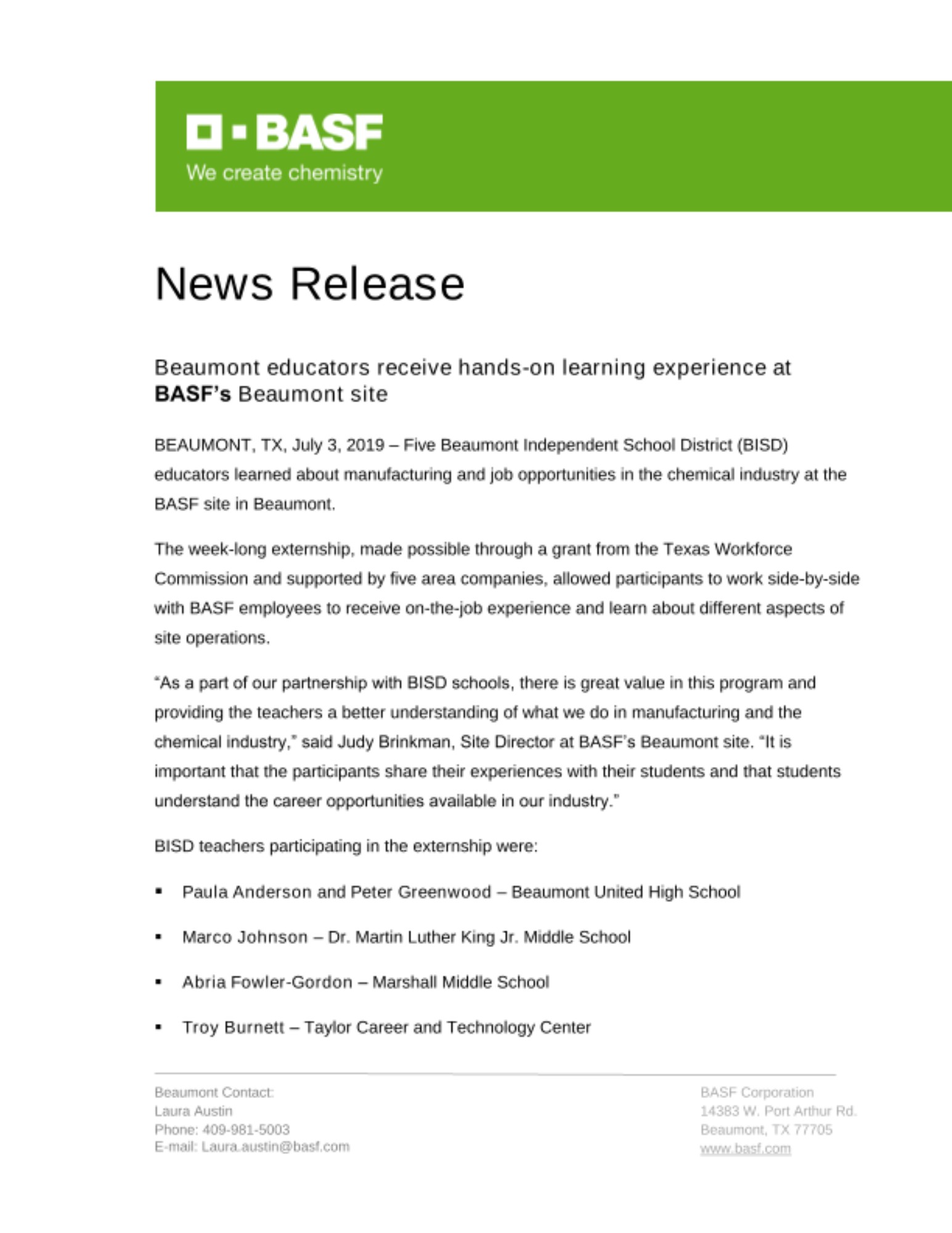 “As a part of our partnership with BISD schools, there is great value in this program and providing the teachers a better understanding of what we do in manufacturing and the chemical industry,” said Judy Brinkman, Site Director at BASF’s Beaumont site. “It is important that the participants share their experiences with their students and that students understand the career opportunities available in our industry.”