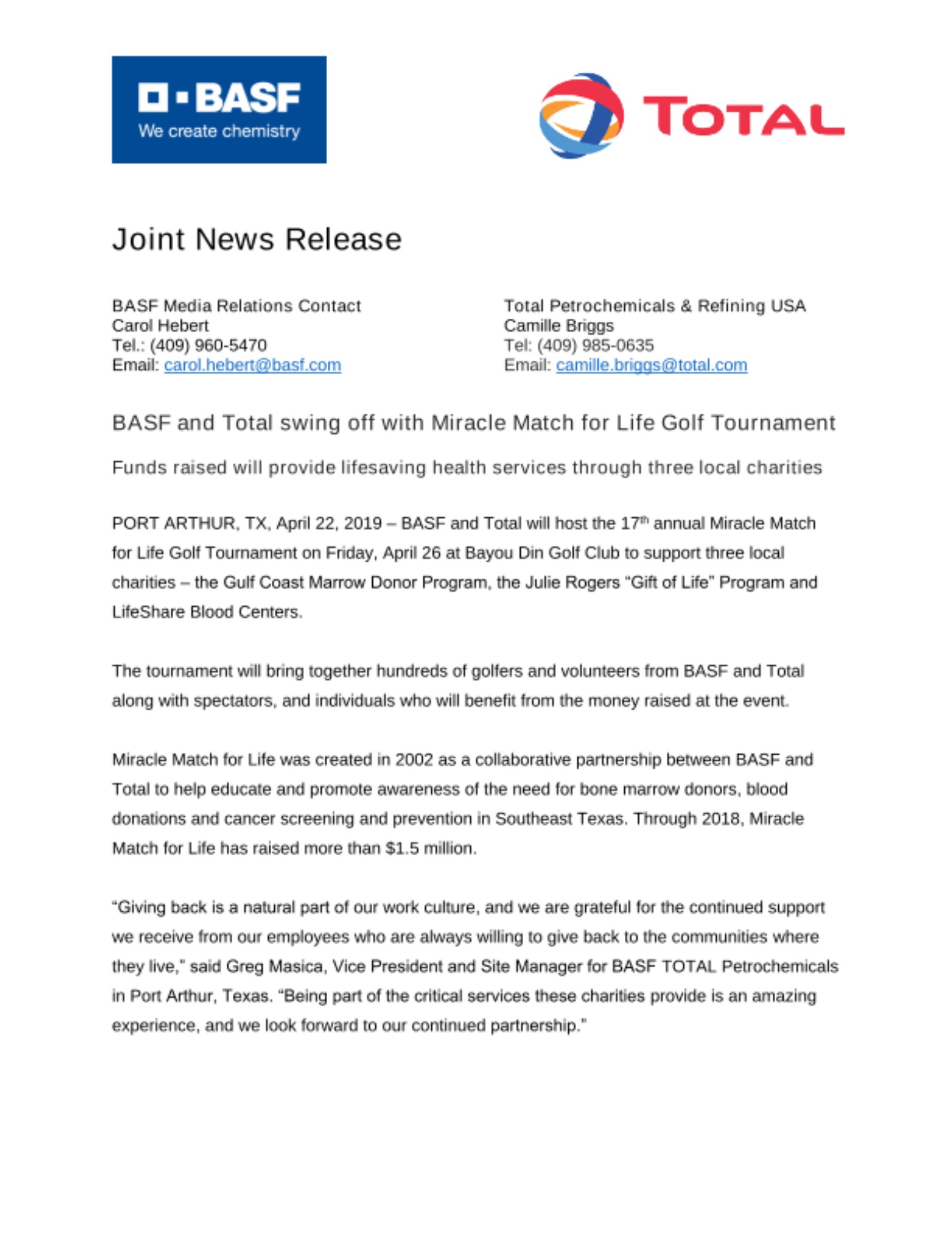 PORT ARTHUR, TX, April 22, 2019 – BASF and Total will host the 17th annual Miracle Match for Life Golf Tournament on Friday, April 26 at Bayou Din Golf Club to support three local charities – the Gulf Coast Marrow Donor Program, the Julie Rogers “Gift of Life” Program and LifeShare Blood Centers.