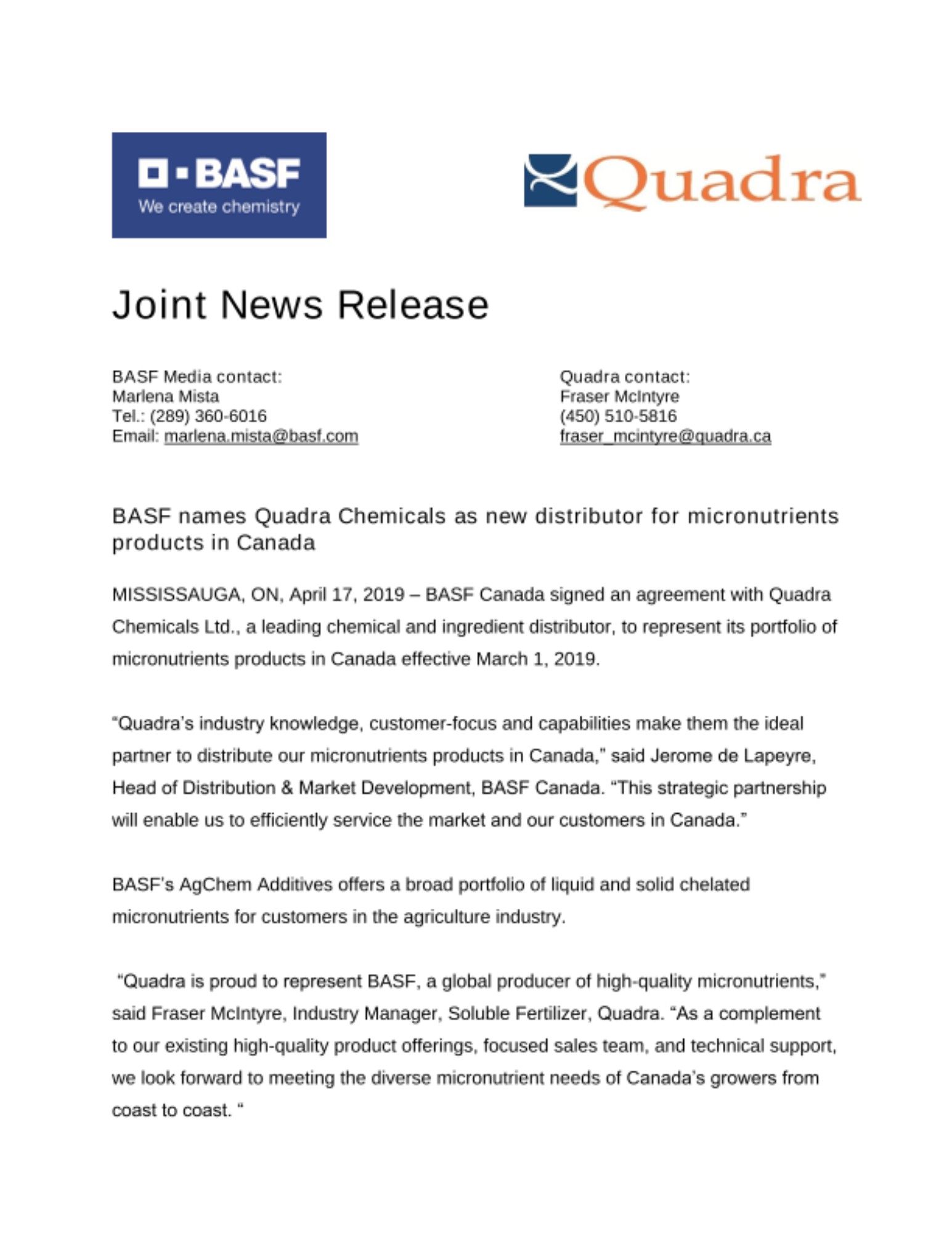 “Quadra’s industry knowledge, customer-focus and capabilities make them the ideal partner to distribute our micronutrients products in Canada,” said Jerome de Lapeyre, Head of Distribution & Market Development, BASF Canada. “This strategic partnership will enable us to efficiently service the market and our customers in Canada.”