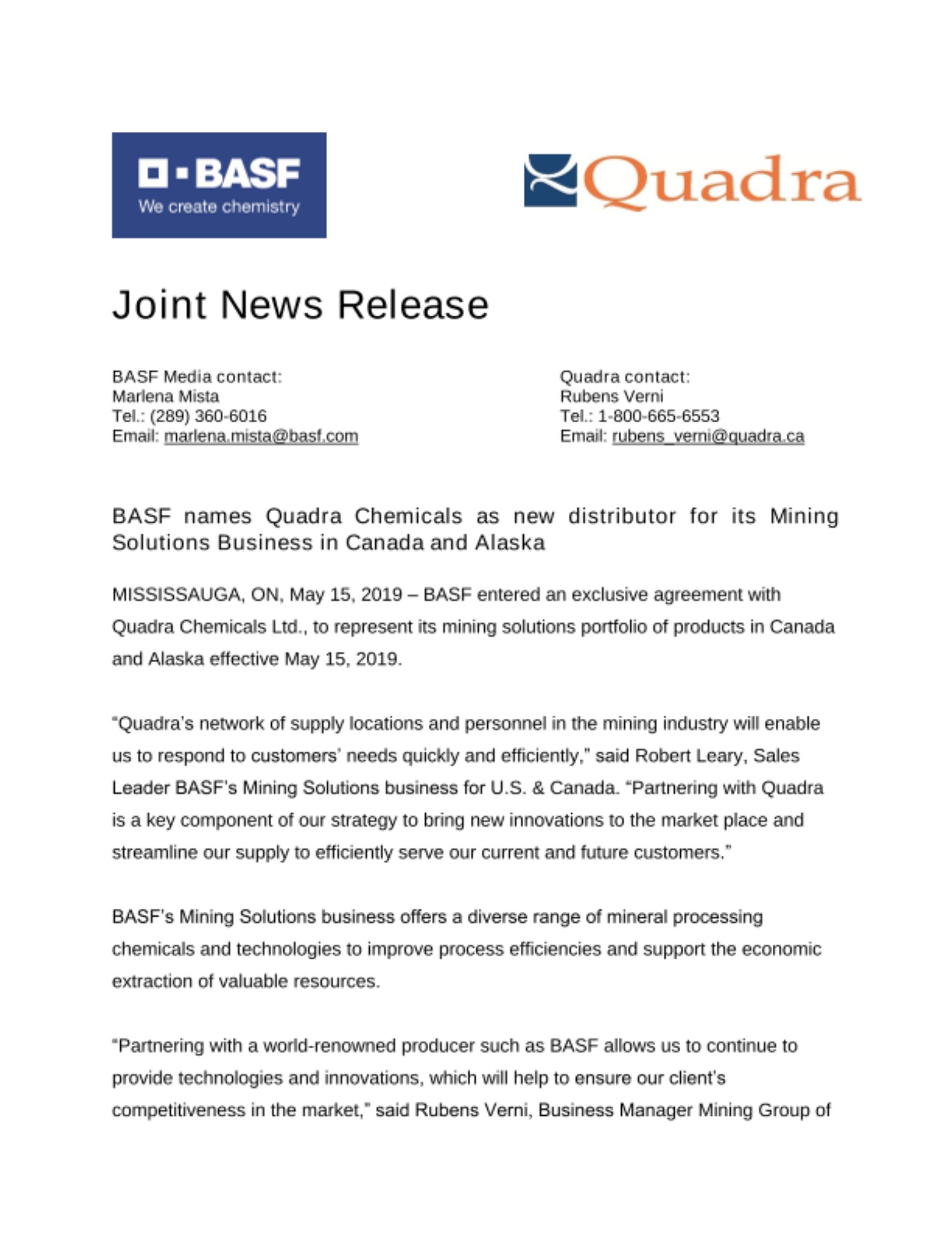 “Partnering with a world-renowned producer such as BASF allows us to continue to provide technologies and innovations, which will help to ensure our client’s competitiveness in the market,” said Rubens Verni, Business Manager Mining Group of Quadra Chemicals Ltd. “We are excited about this new partnership and look forward to working in collaboration with BASF.”