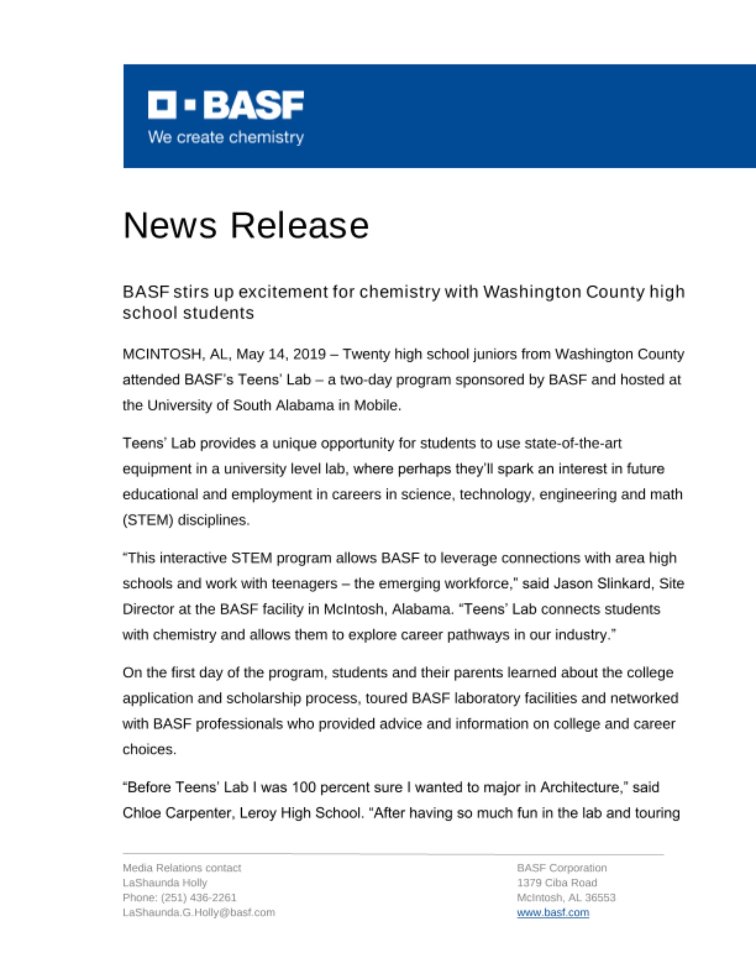 “This interactive STEM program allows BASF to leverage connections with area high schools and work with teenagers – the emerging workforce,” said Jason Slinkard, Site Director at the BASF facility in McIntosh, Alabama. “Teens’ Lab connects students with chemistry and allows them to explore career pathways in our industry.”