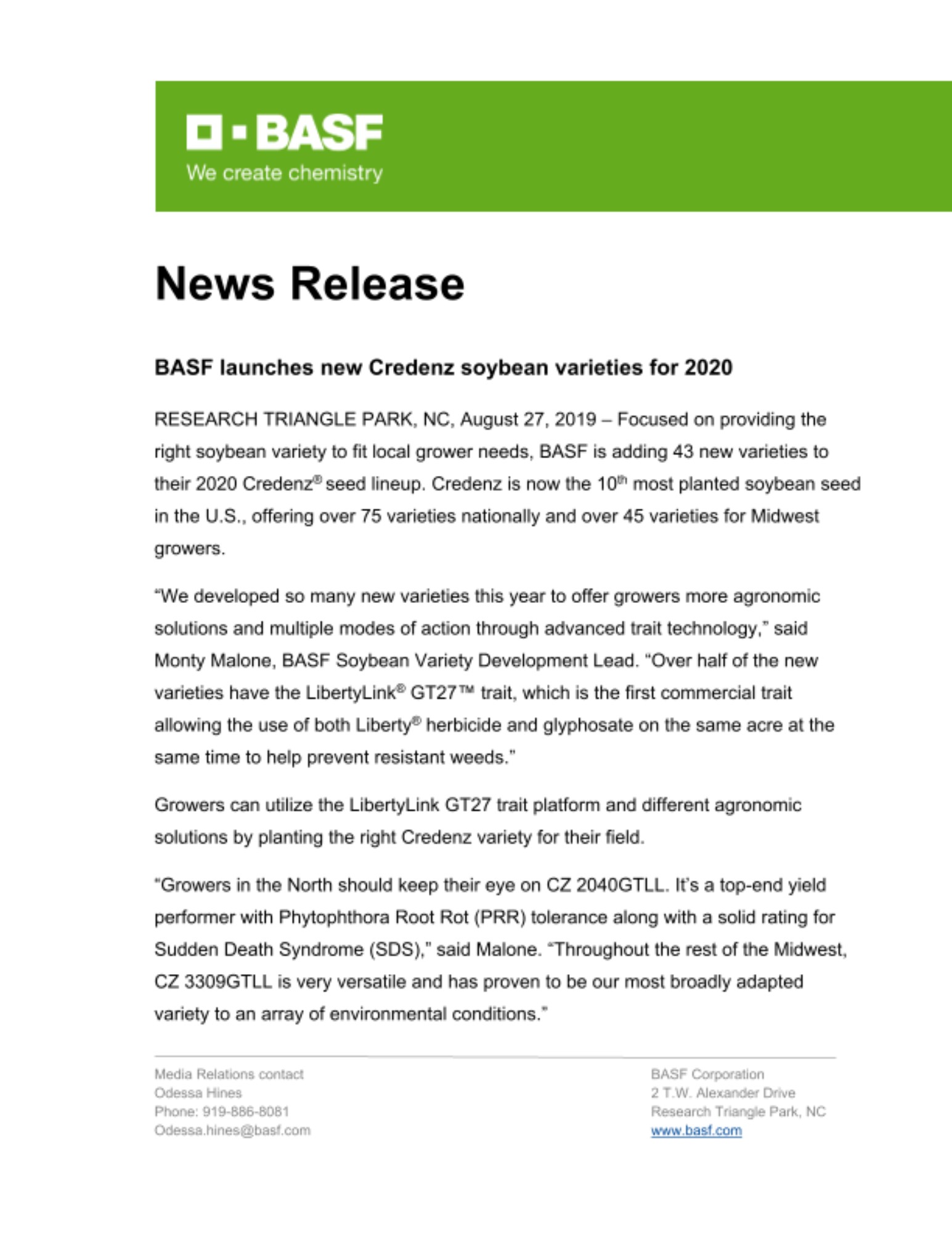 RESEARCH TRIANGLE PARK, NC, August 27, 2019 – Focused on providing the right soybean variety to fit local grower needs, BASF is adding 43 new varieties to their 2020 Credenz® seed lineup. Credenz is now the 10th most planted soybean seed in the U.S., offering over 75 varieties nationally and over 45 varieties for Midwest growers.