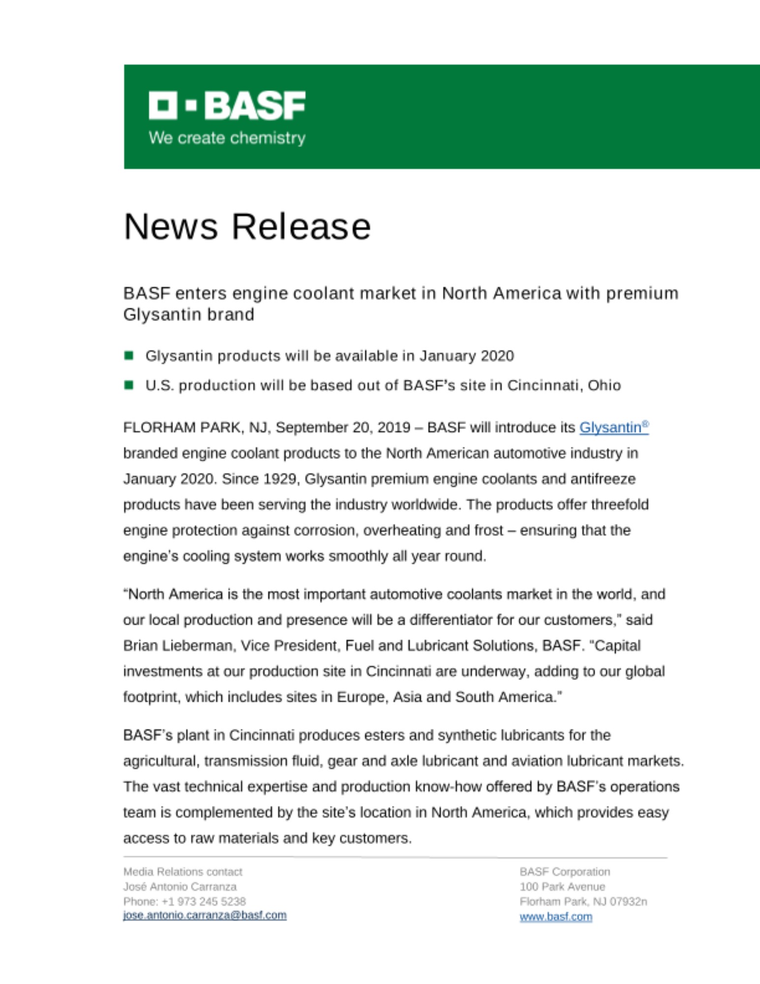 FLORHAM PARK, NJ, September 20, 2019 – BASF will introduce its Glysantin® branded engine coolant products to the North American automotive industry in January 2020. Since 1929, Glysantin premium engine coolants and antifreeze products have been serving the industry worldwide. The products offer threefold engine protection against corrosion, overheating and frost – ensuring that the engine’s cooling system works smoothly all year round.