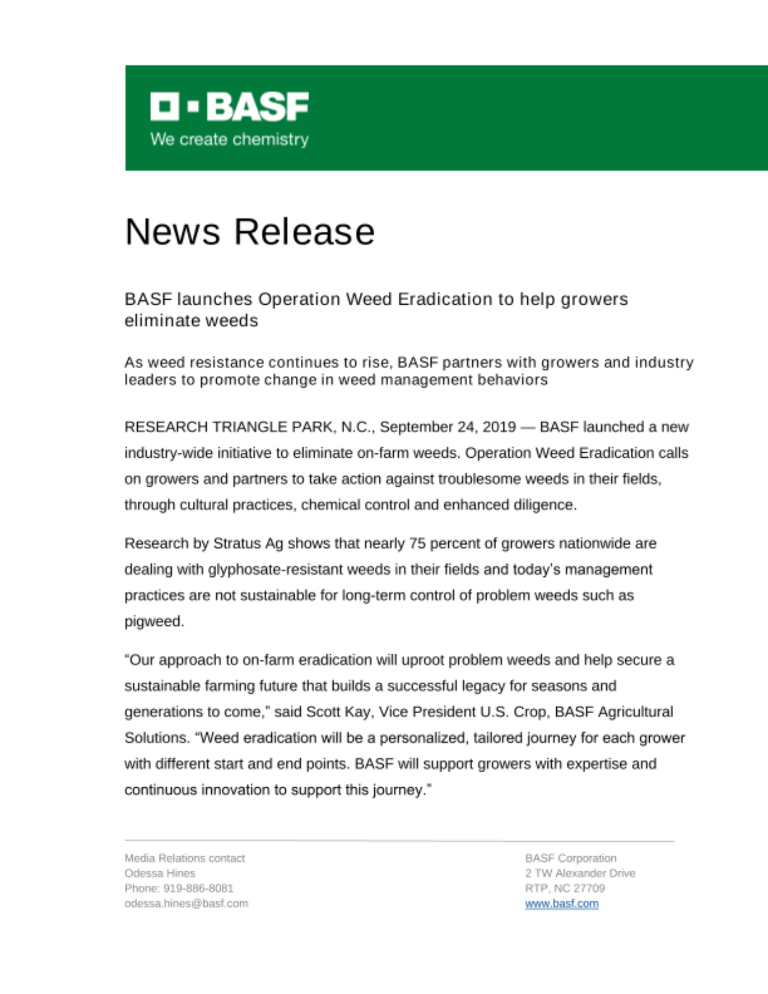 RESEARCH TRIANGLE PARK, N.C., September 24, 2019 — BASF launched a new industry-wide initiative to eliminate on-farm weeds. Operation Weed Eradication calls on growers and partners to take action against troublesome weeds in their fields, through cultural practices, chemical control and enhanced diligence.