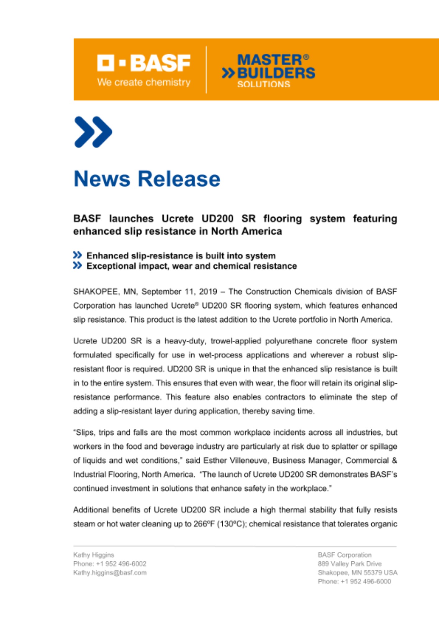 SHAKOPEE, MN, September 11, 2019 – The Construction Chemicals division of BASF Corporation has launched Ucrete® UD200 SR flooring system, which features enhanced slip resistance. This product is the latest addition to the Ucrete portfolio in North America.