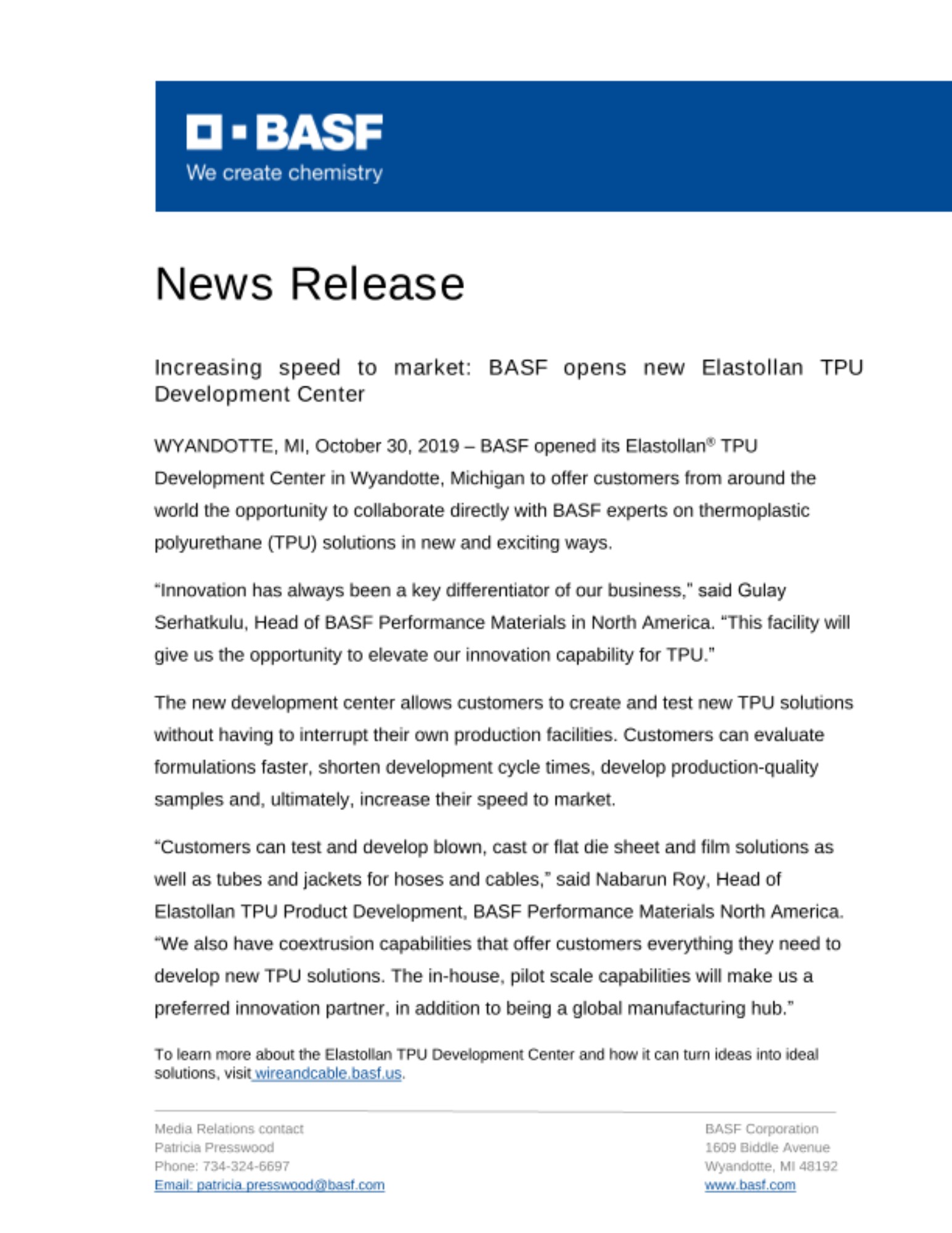 “Customers can test and develop blown, cast or flat die sheet and film solutions as well as tubes and jackets for hoses and cables,” said Nabarun Roy, Head of Elastollan TPU Product Development, BASF Performance Materials North America. “We also have coextrusion capabilities that offer customers everything they need to develop new TPU solutions. The in-house, pilot scale capabilities will make us a preferred innovation partner, in addition to being a global manufacturing hub.”